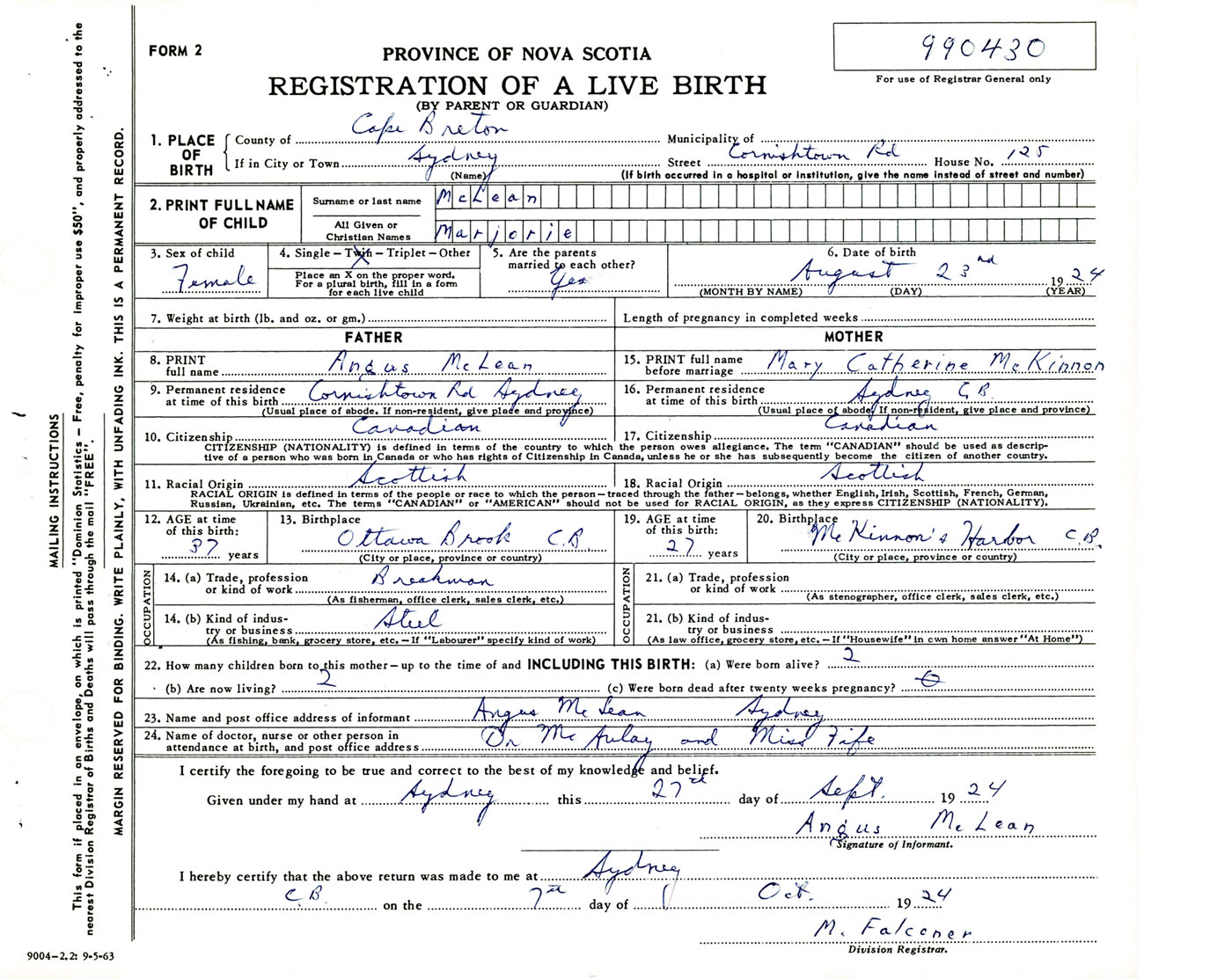 Name of Father Angus McLean MAIDEN NAME of Mother Mary Catherine McKinnon