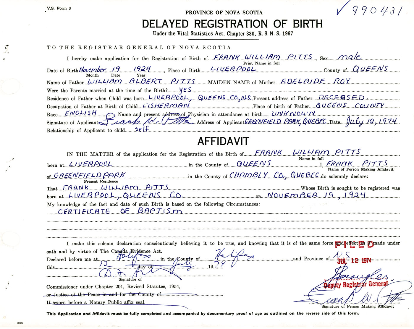 Signature of Applicant Frank W. Pitts Address of Applicant Greenfield Park, Quebec Date 12 July 1974