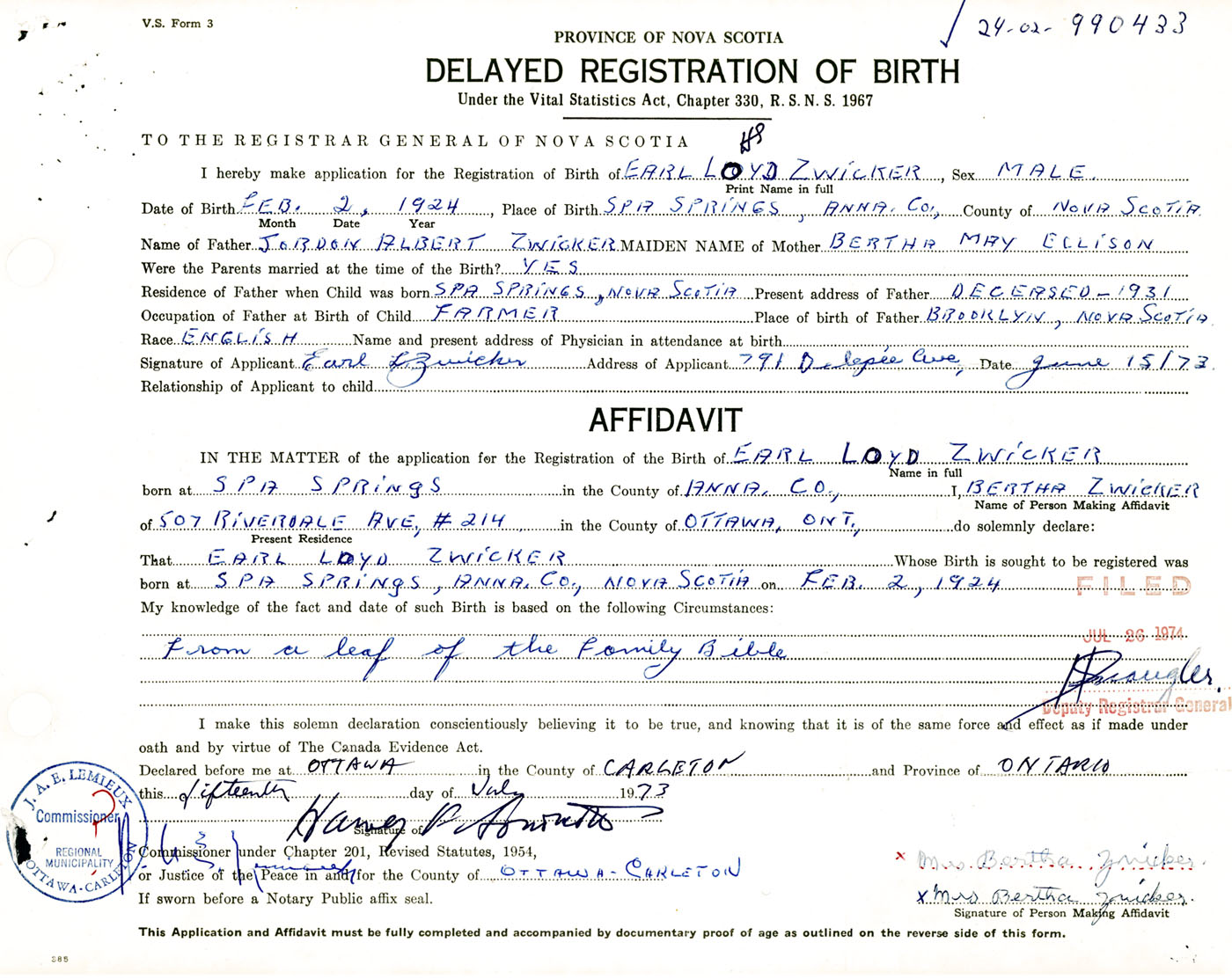 IN THE MATTER of the application for the Registration of the Birth of Earl LoydZwicker