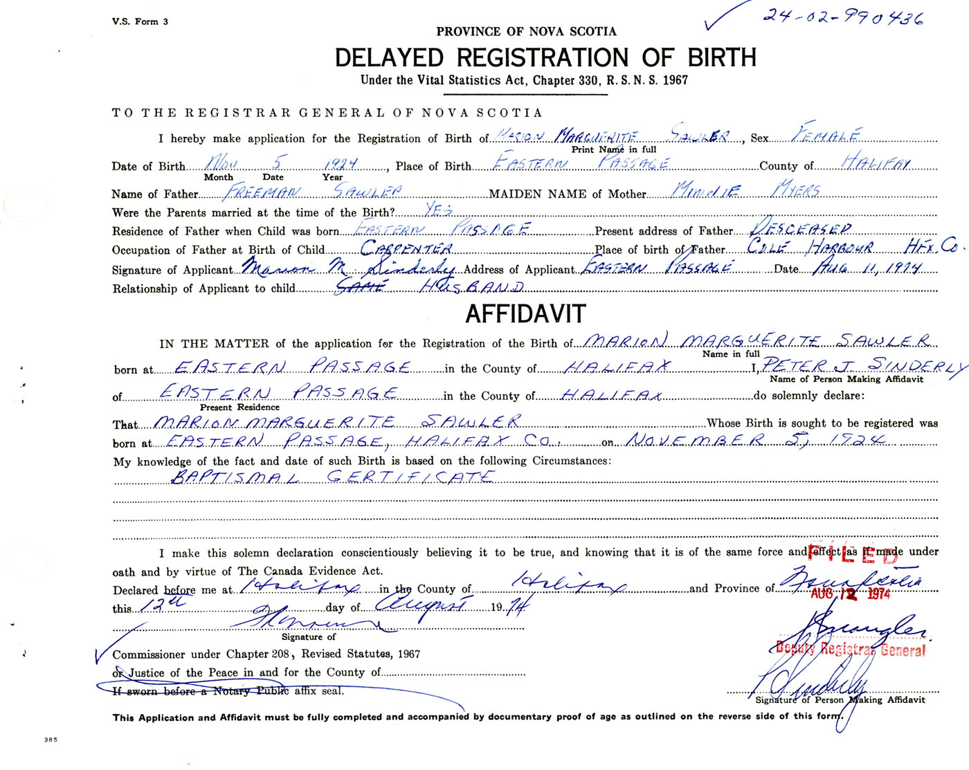 Signature of Applicant Marion M. Sinderly Address of Applicant Eastern Passage, Halifax Co., NS Date 11 August 1974