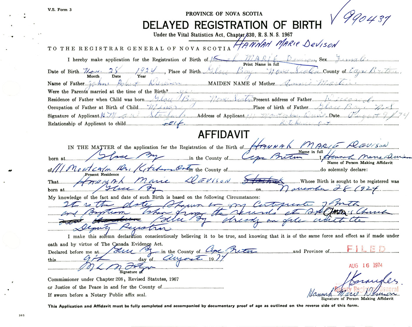 IN THE MATTER of the application for the Registration of the Birth of Hannah MarieDevison