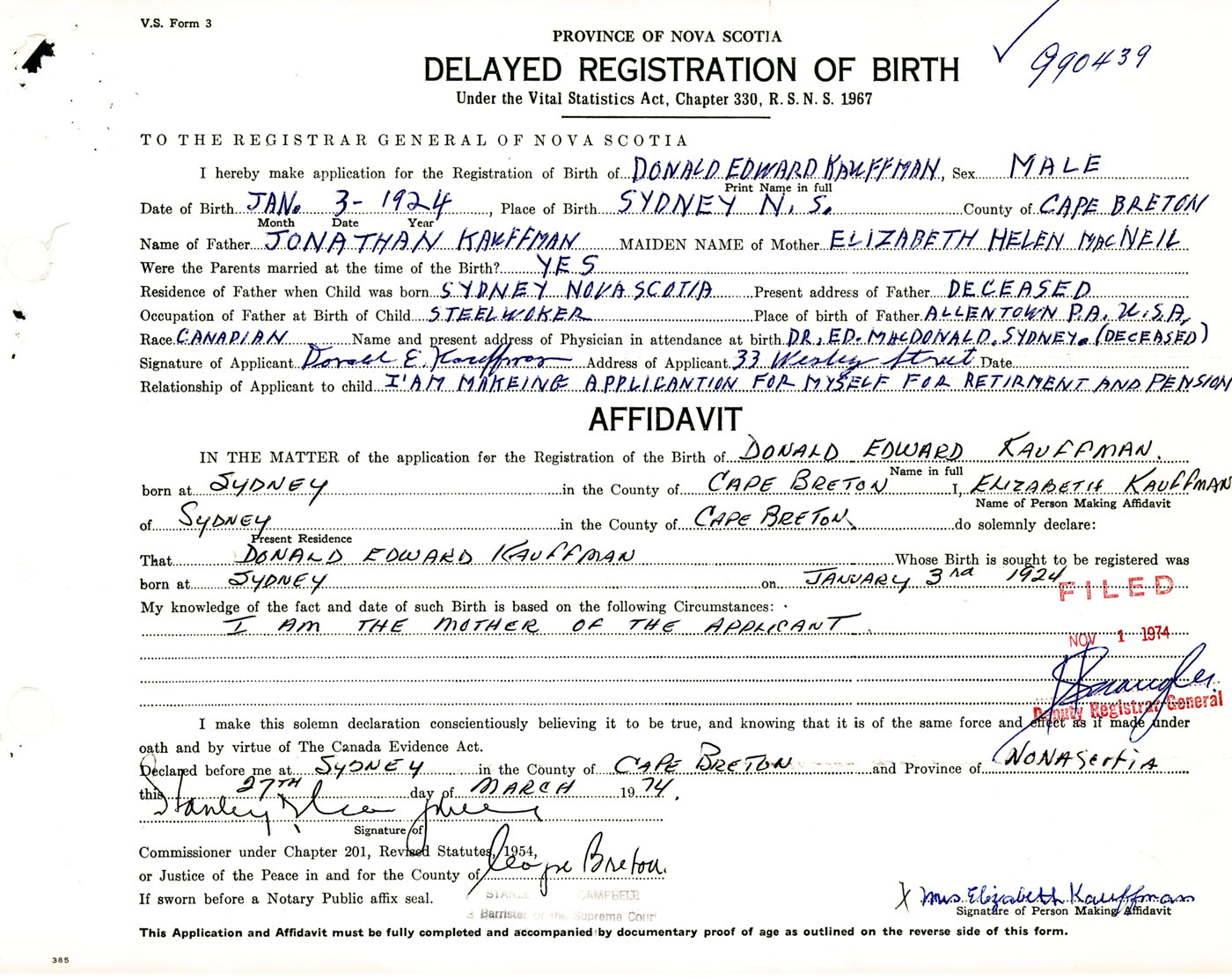Signature of Applicant Donald E. Kauffman Address of Applicant 33 Wesley Street, Sydney, Cape Breton Co., NS Date 27 March 1974