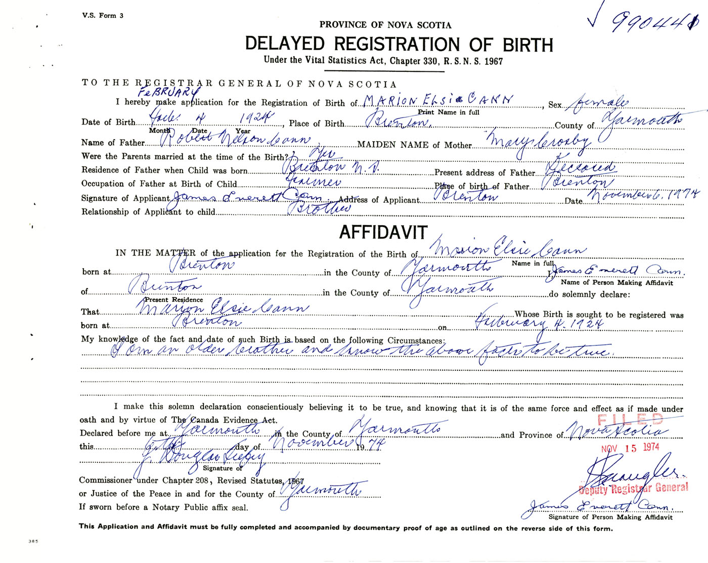 Signature of Applicant James Everett Cann Address of Applicant Brenton, Yarmouth Co., NS Date 6 November 1974