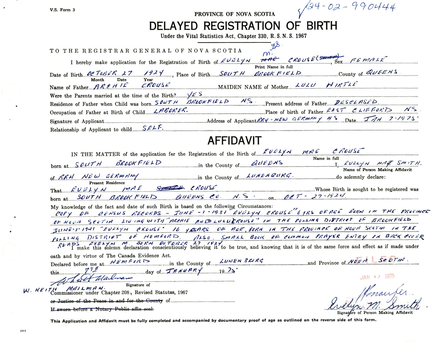 Signature of Applicant Evelyn M. Smith Address of Applicant RR #4, New Germany, Lunenburg Co., NS Date 7 January 1975