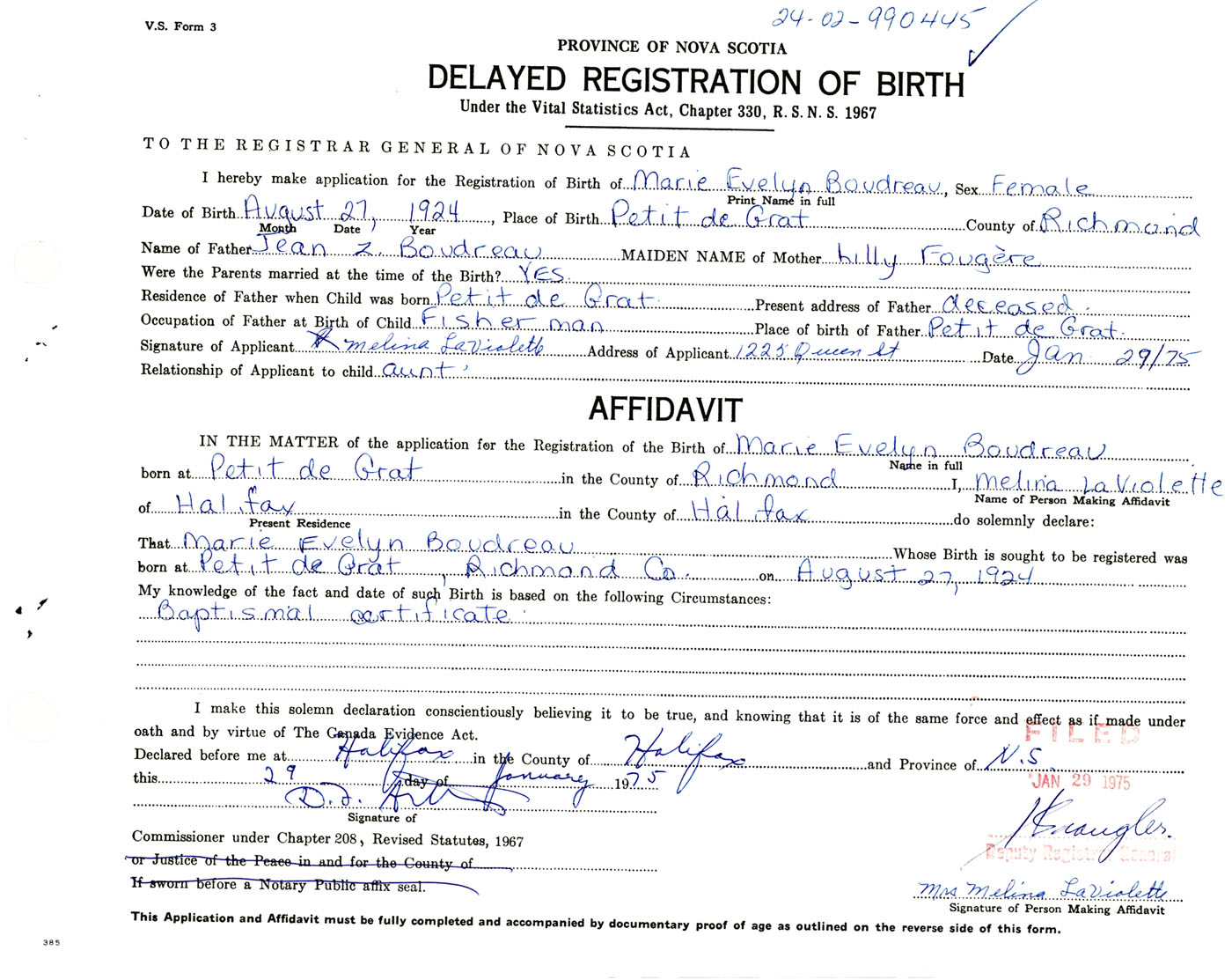 I hereby make application for the Registration of Birth of Marie EvelynBoudreau Sex Female
