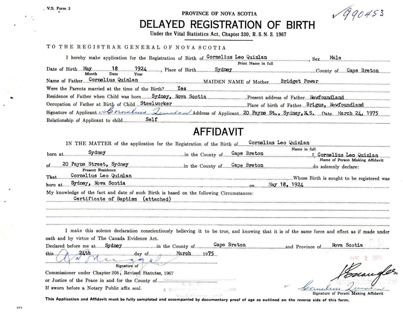 Signature of Applicant Cornelius Quinlan Address of Applicant 20 Payne Street, Sydney, Cape Breton Co., NS Date 24 March 1975