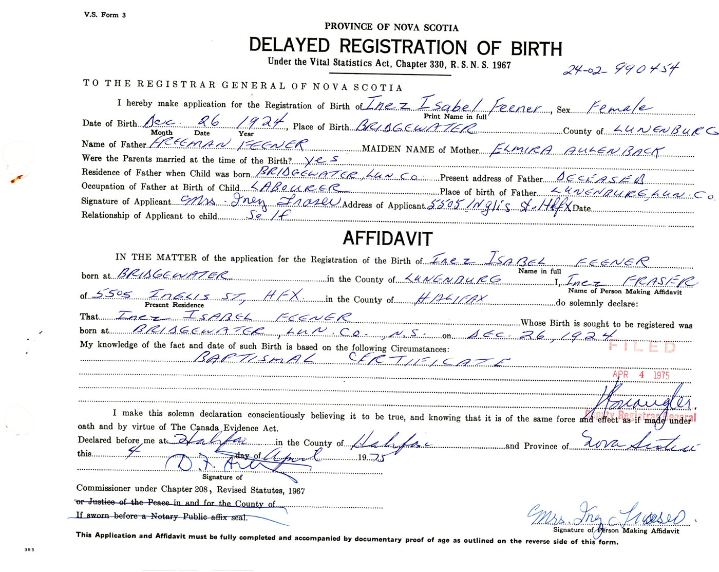 Signature of Applicant Mrs. Inez Fraser Address of Applicant 5505 Inglis Street, Halifax, NS Date 4 April 1975