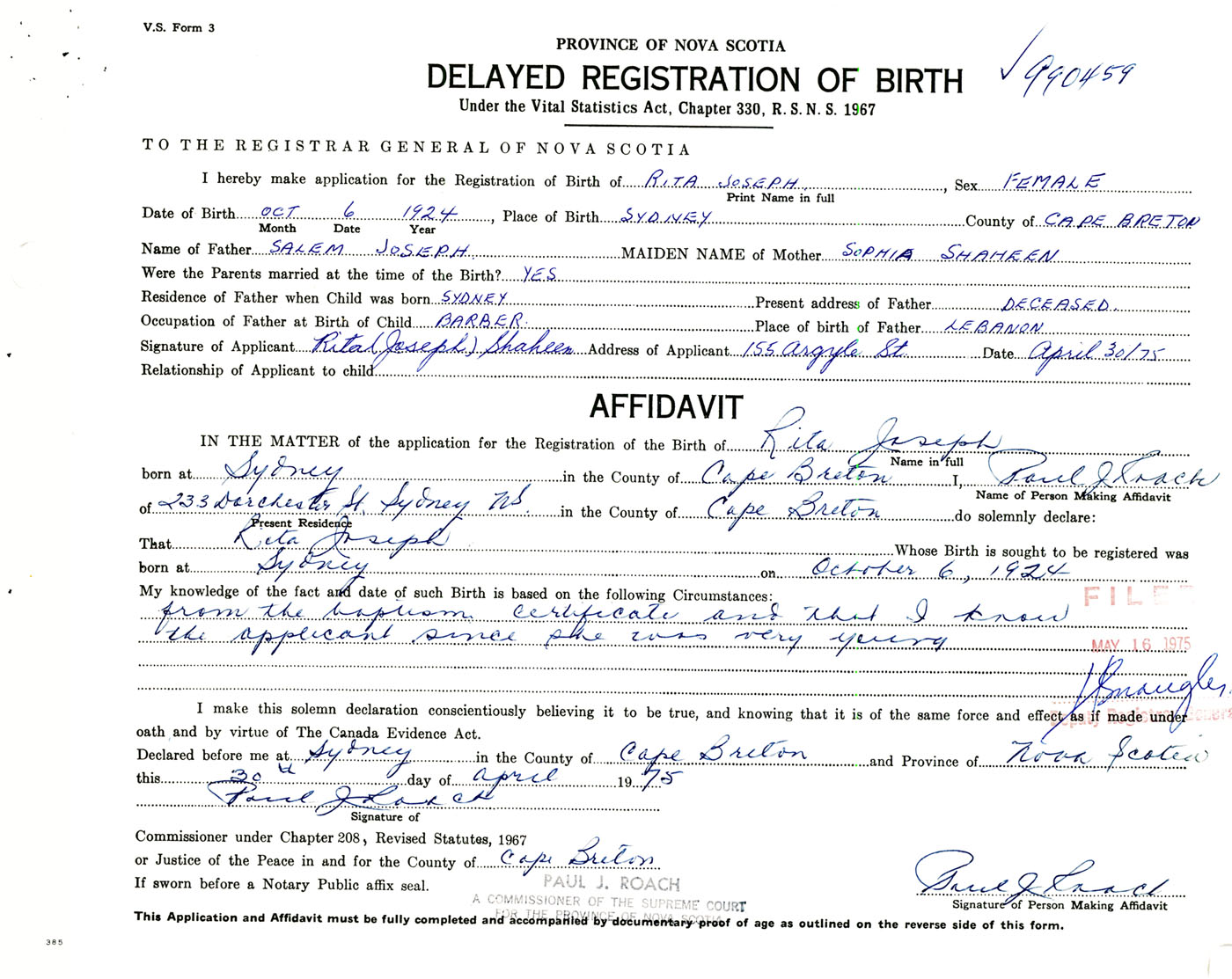 Signature of Applicant Rita (Joseph) Shaheen Address of Applicant 155 Argyle Street, Sydney, Cape Breton Co., NS Date 30 April 1975