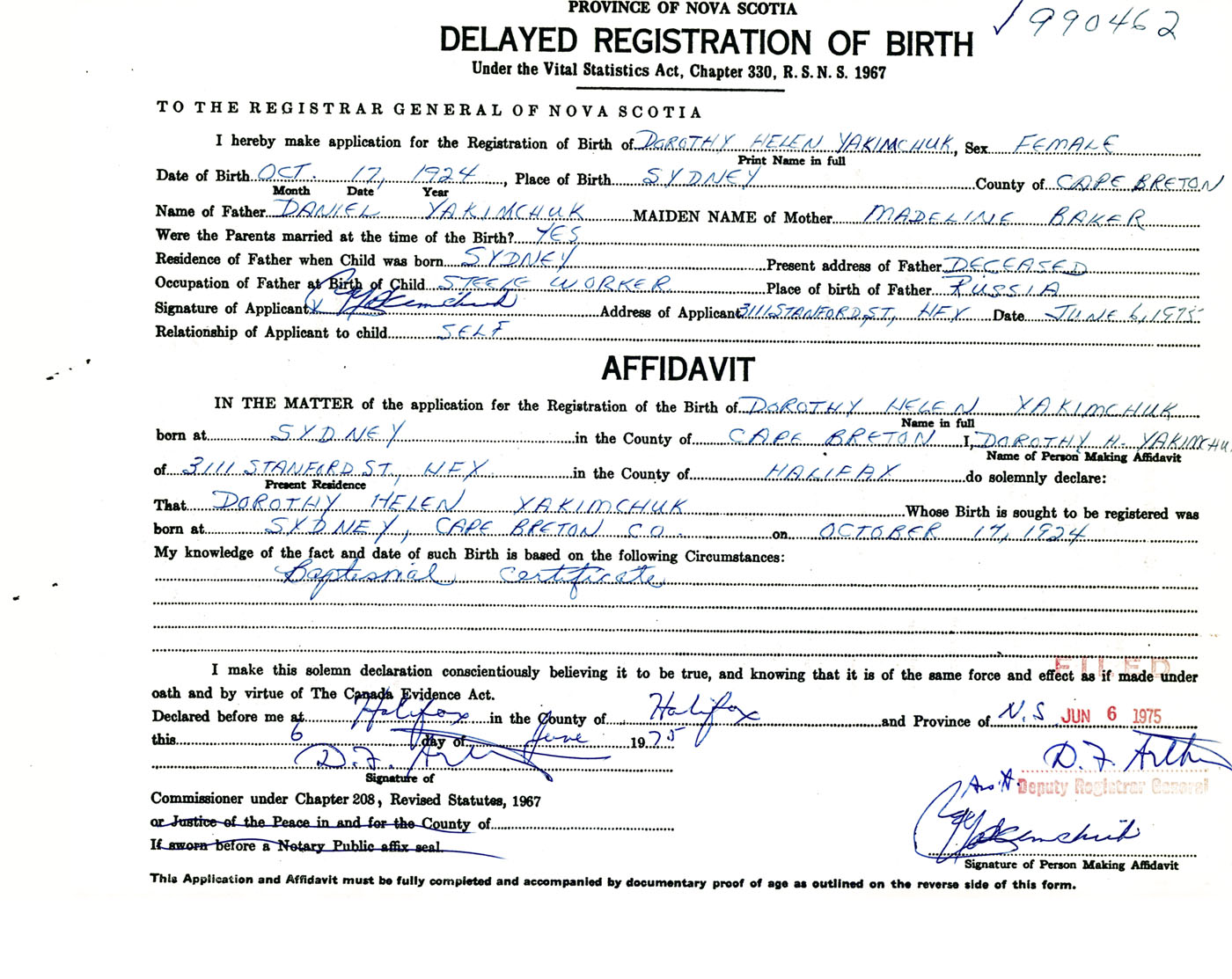 I hereby make application for the Registration of Birth of Dorothy HelenYakimchuk Sex Female