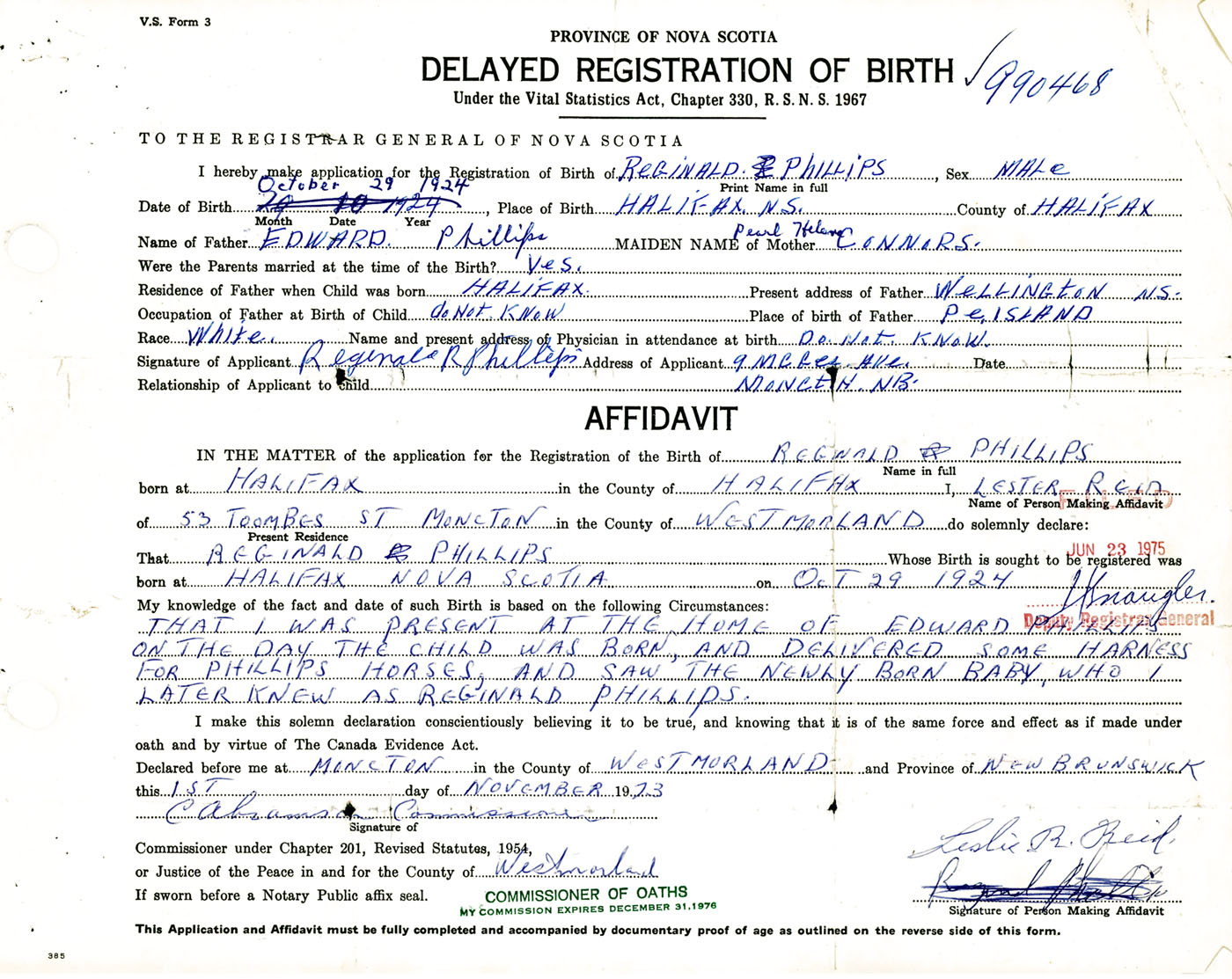 Signature of Applicant Reginald R. Phillips Address of Applicant 9 Magee Avenue, Moncton, NB Date 1 November 1973