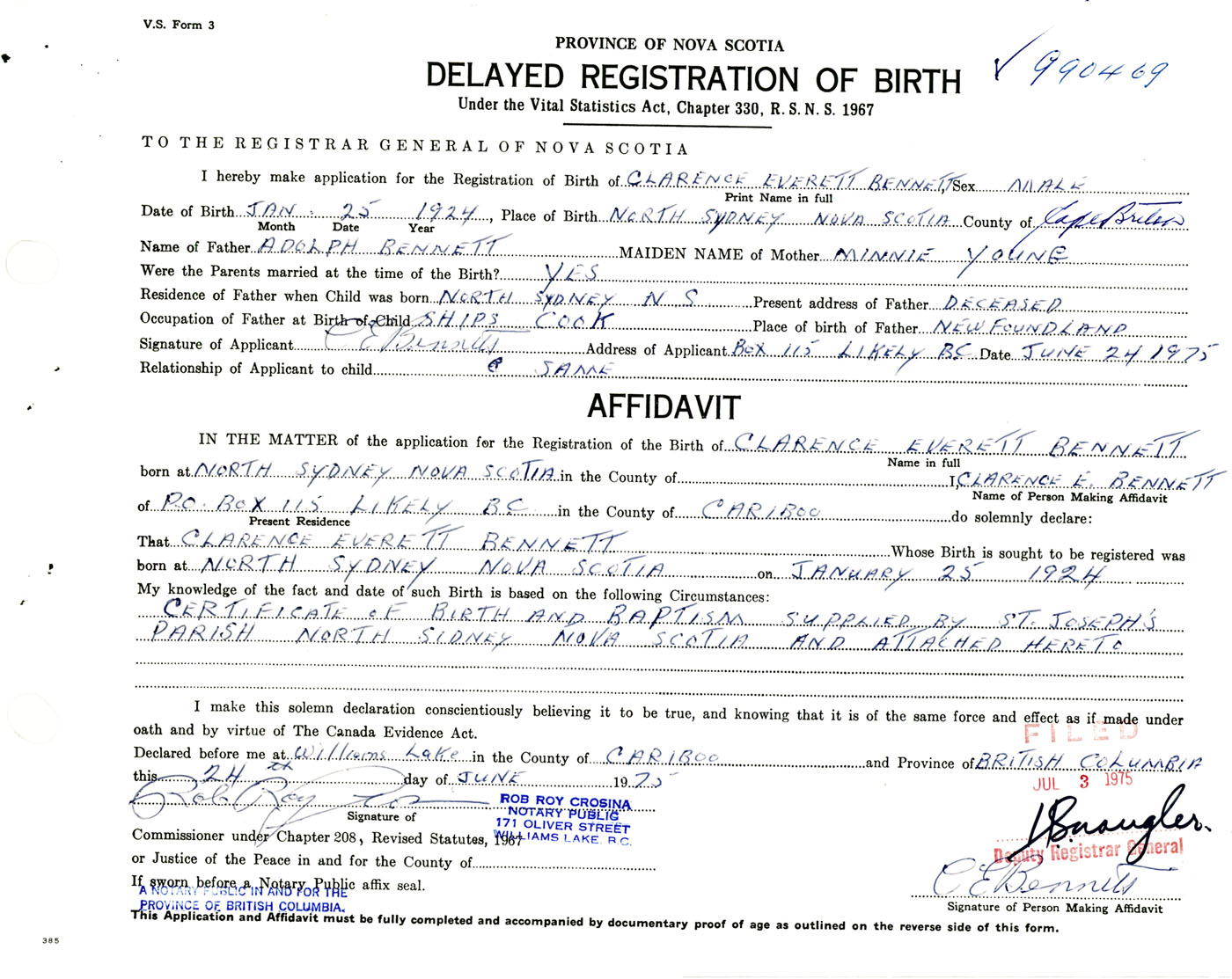 IN THE MATTER of the application for the Registration of the Birth of Clarence EverettBennett
