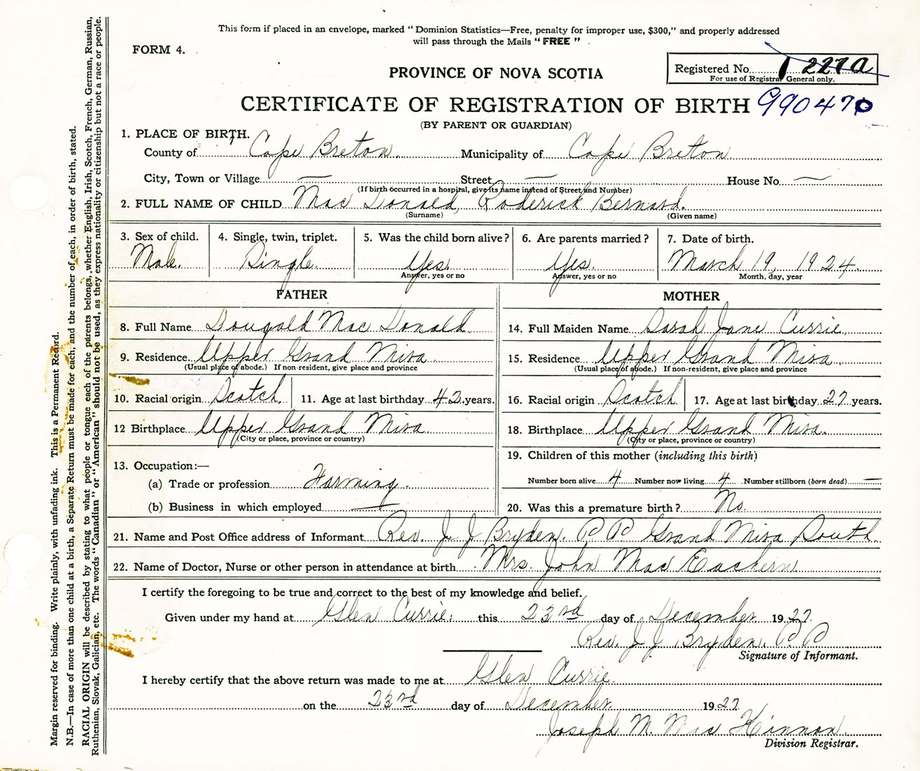 Date of Birth March 19, 1924 Place of Birth Upper Grand MiraCounty of Cape Breton