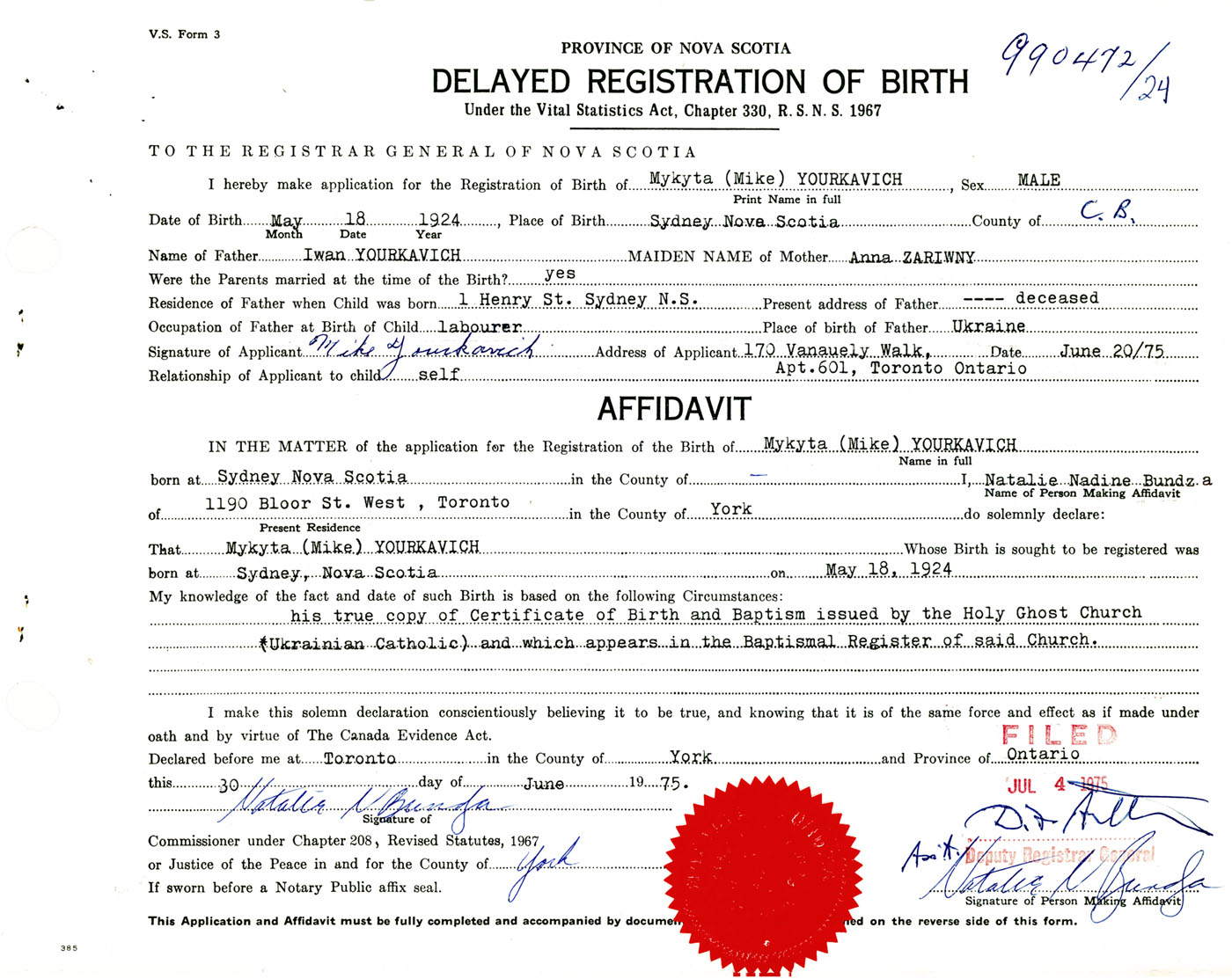 IN THE MATTER of the application for the Registration of the Birth of Mykyta (Mike)Yourkavich