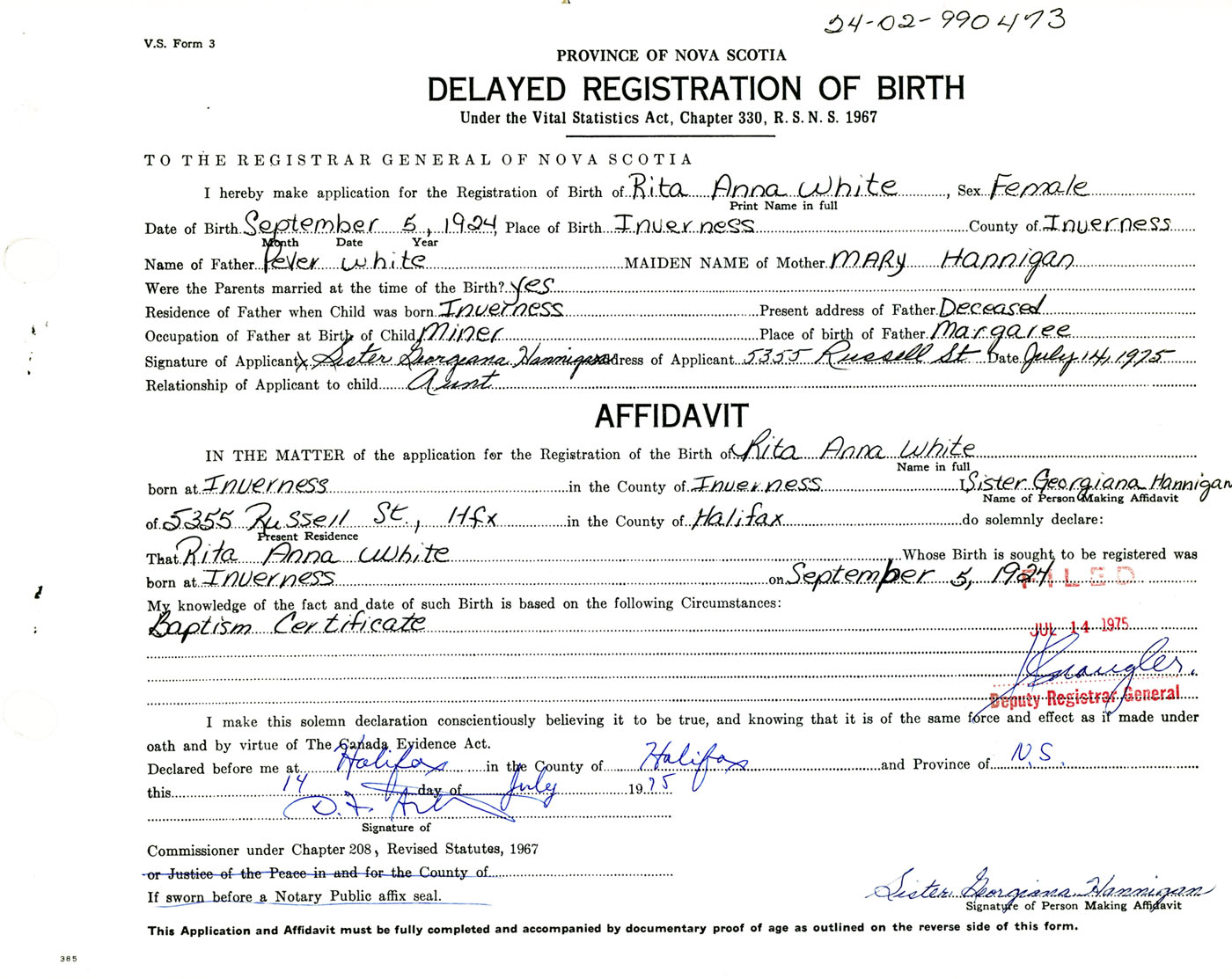 Signature of Applicant Sister Georgiana Hannigan Address of Applicant 5355 Russell Street, Halifax, NS Date 14 July 1975
