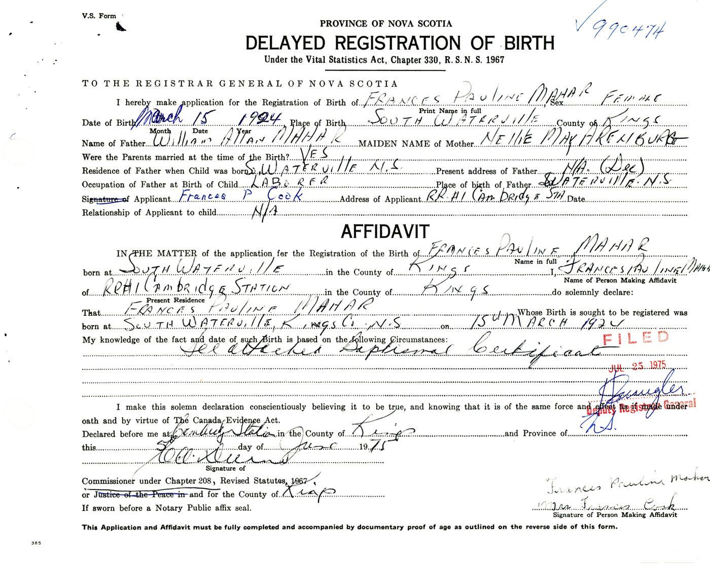 I hereby make application for the Registration of Birth of Frances PaulineMahar Sex Female
