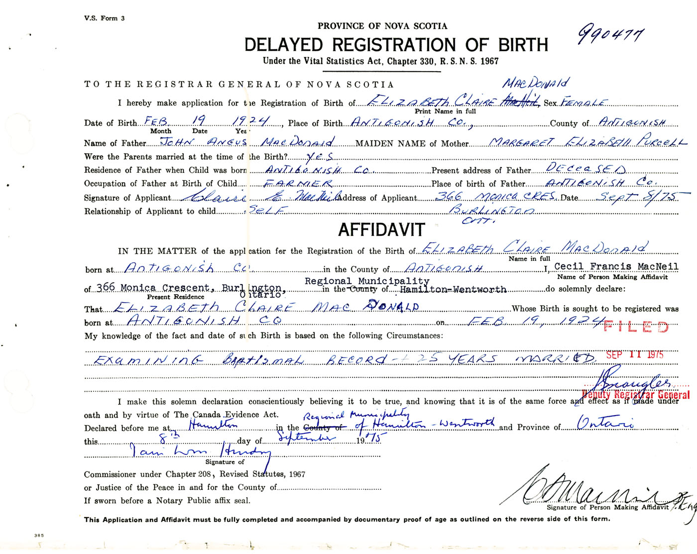 Signature of Applicant Claire E. MacNeil Address of Applicant 366 Monica Crescent, Burlington, Ontario Date 8 September 1975