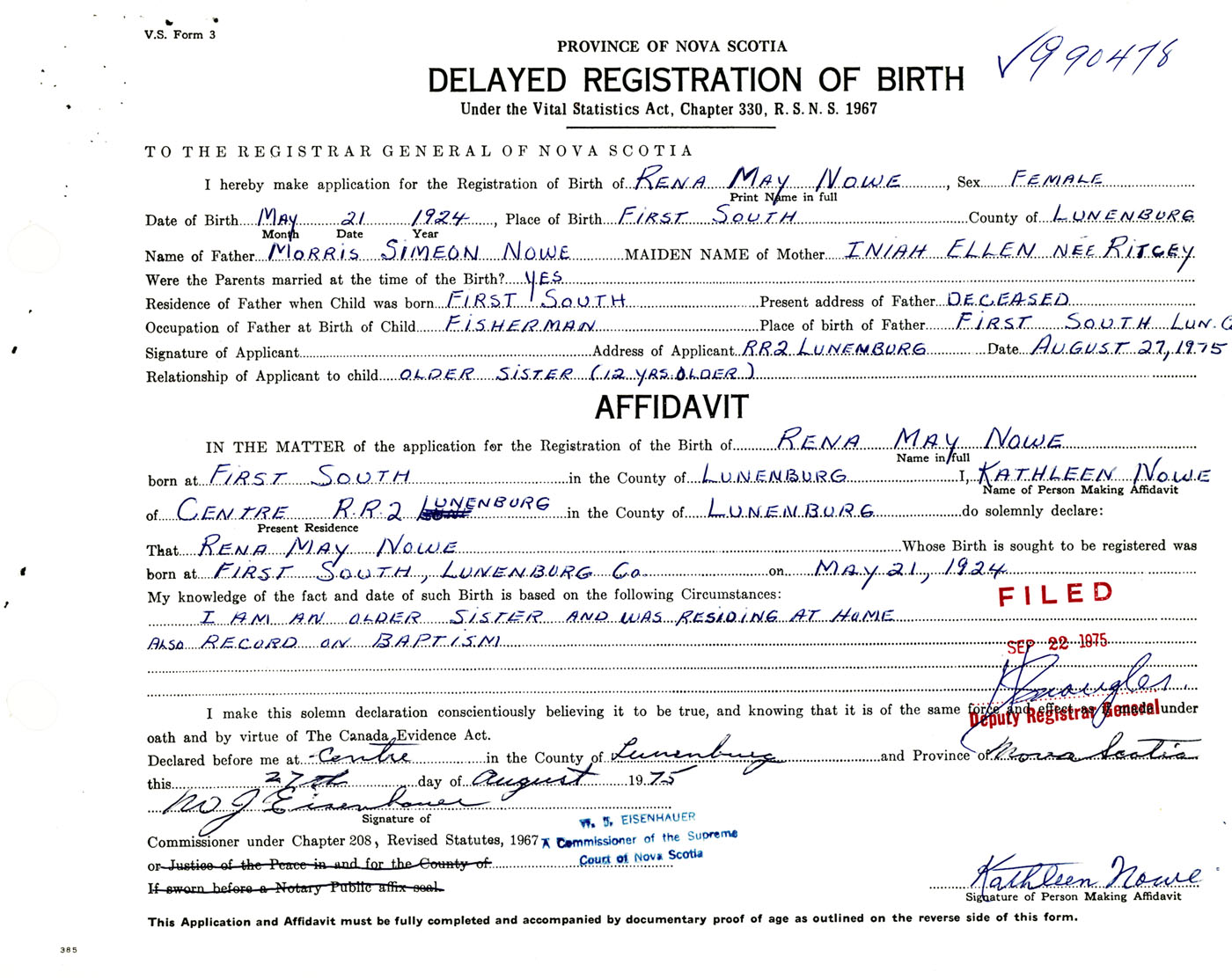 I hereby make application for the Registration of Birth of Rena MayNowe Sex Female