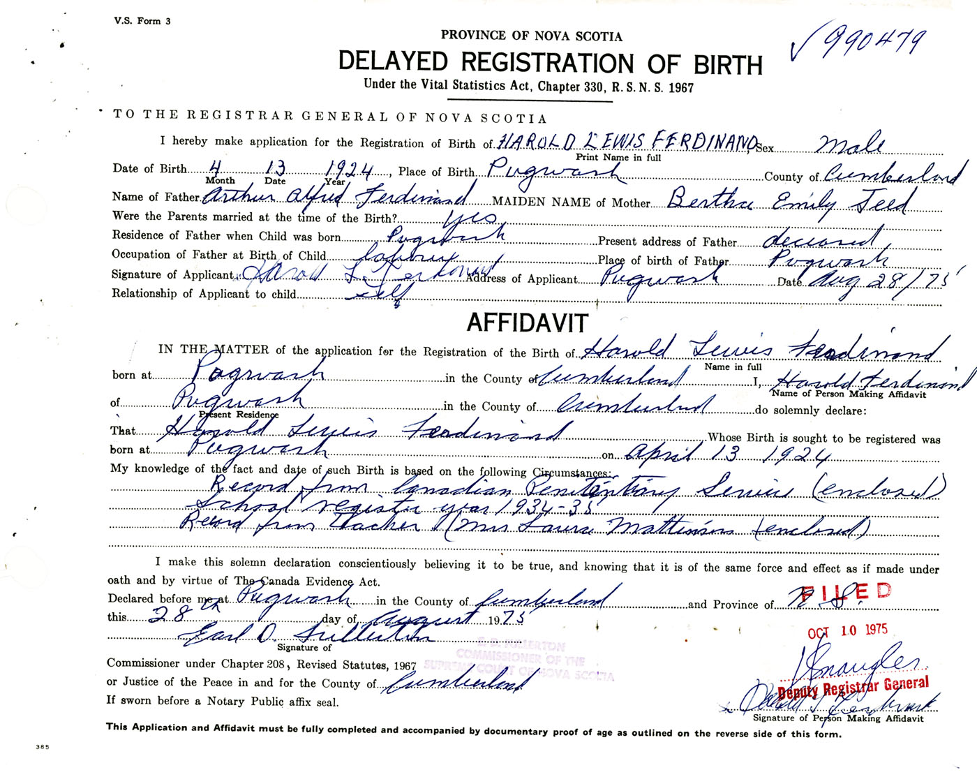 Signature of Applicant Harold L. Ferdinand Address of Applicant Pugwash, Cumberland Co., NS Date 28 August 1975