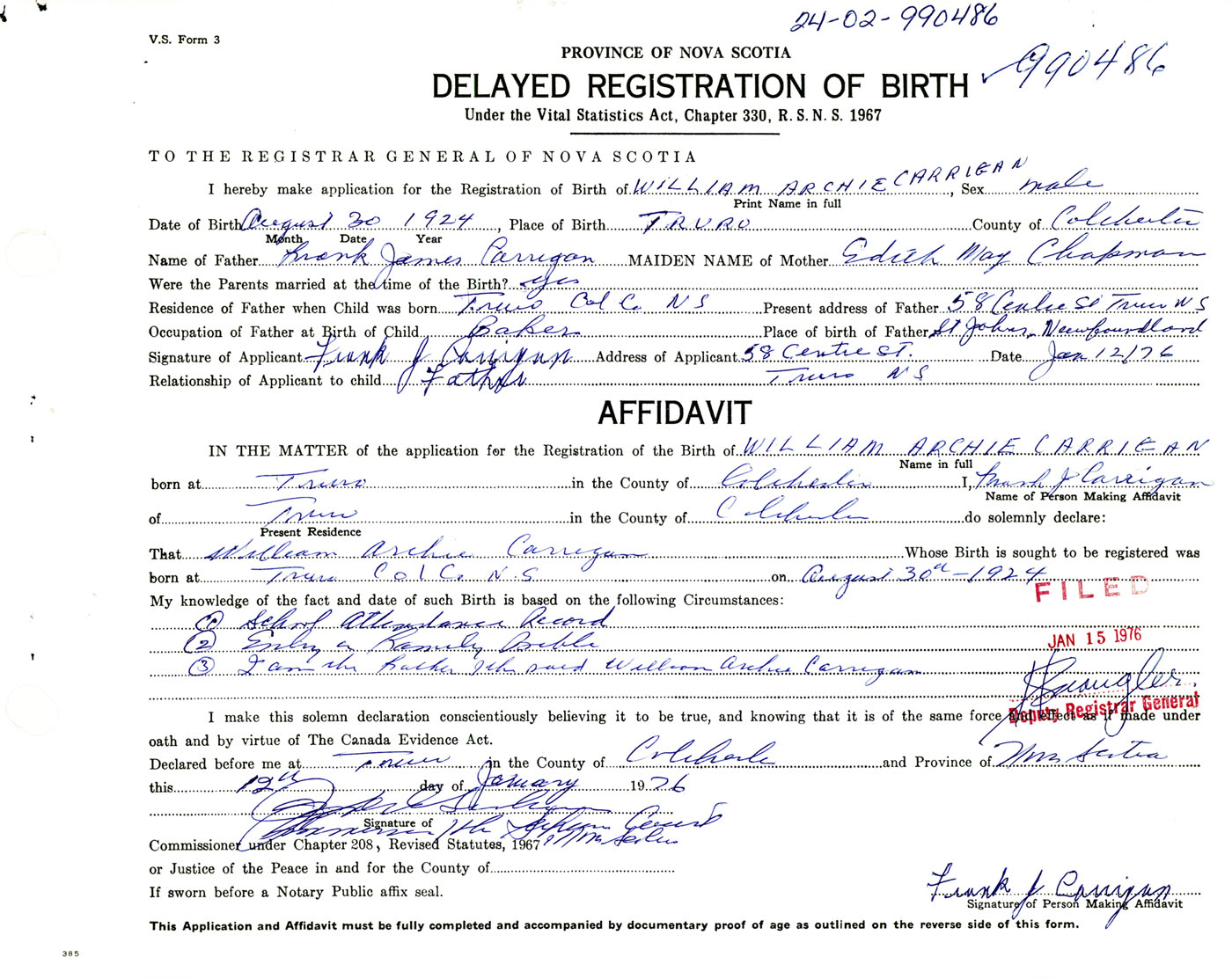 I hereby make application for the Registration of Birth of William ArchieCarrigan Sex Male