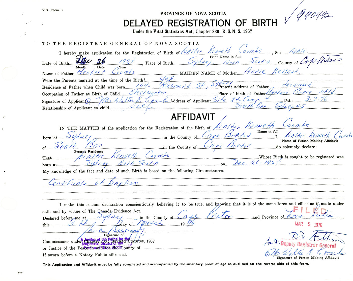 I hereby make application for the Registration of Birth of Walter KennethCoombs Sex Male