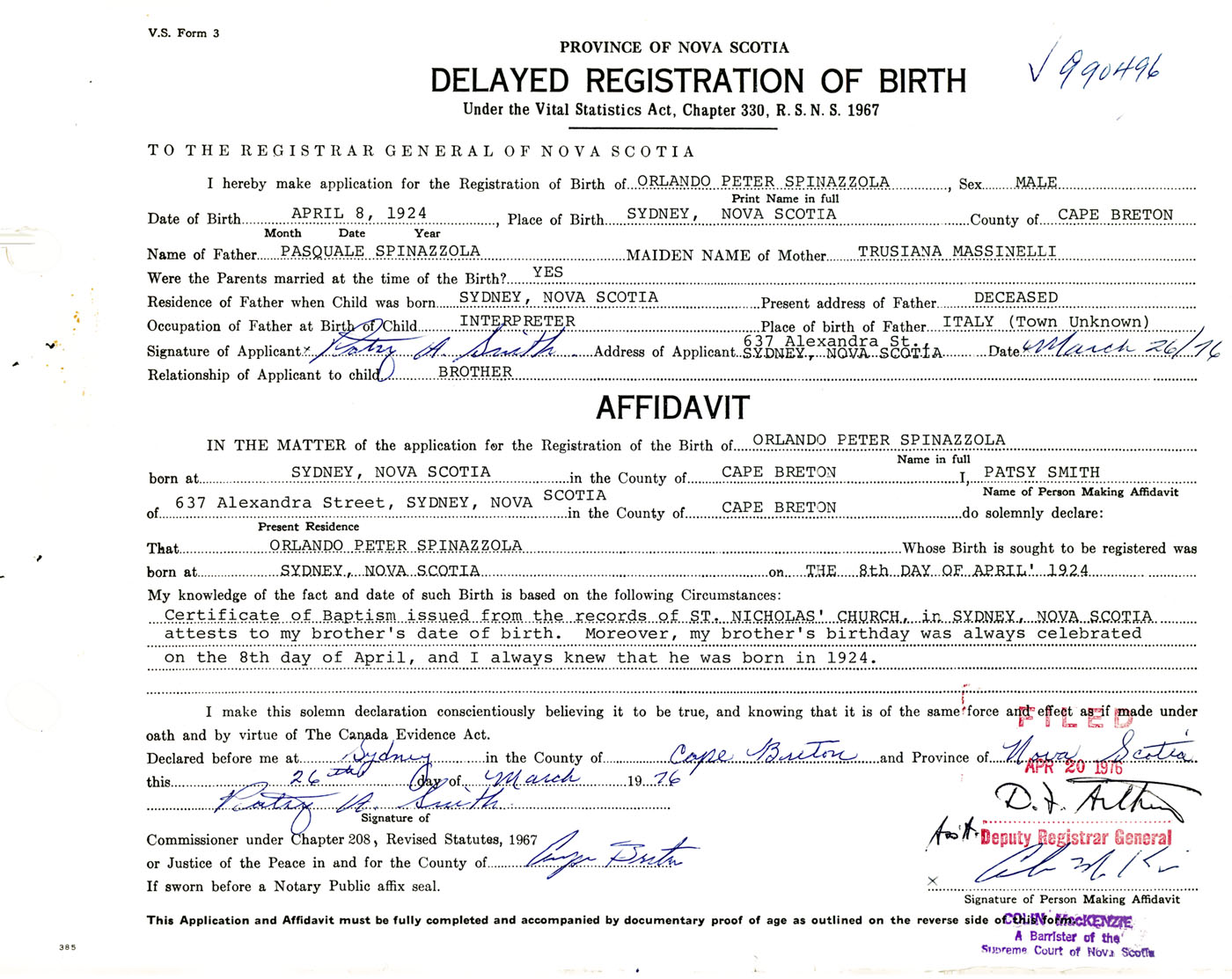 I hereby make application for the Registration of Birth of Orlando PeterSpinazzola Sex Male