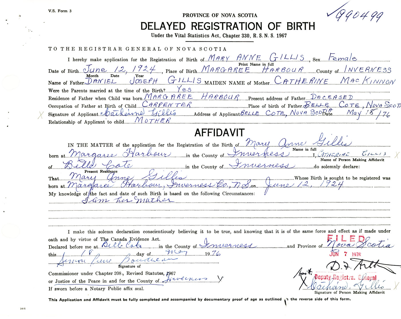 Date of Birth June 12, 1924 Place of Birth Margaree HarbourCounty of Inverness