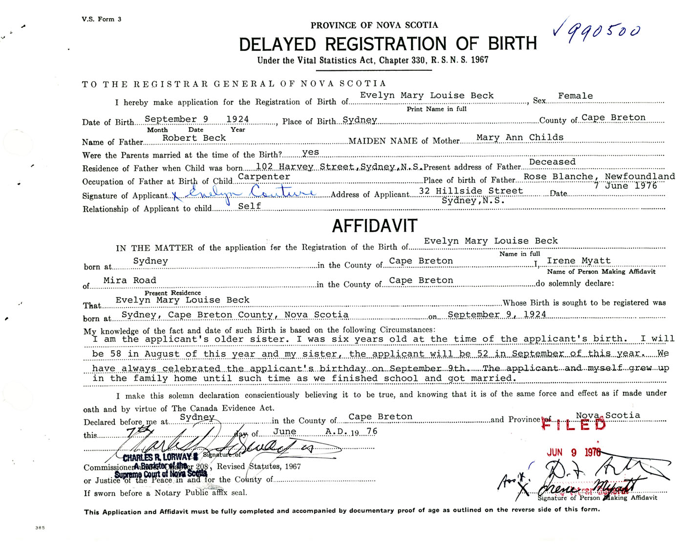 Signature of Applicant Evelyn Couture Address of Applicant 32 Hillside Street, Sydney, Cape Breton Co., NS Date 7 June 1976