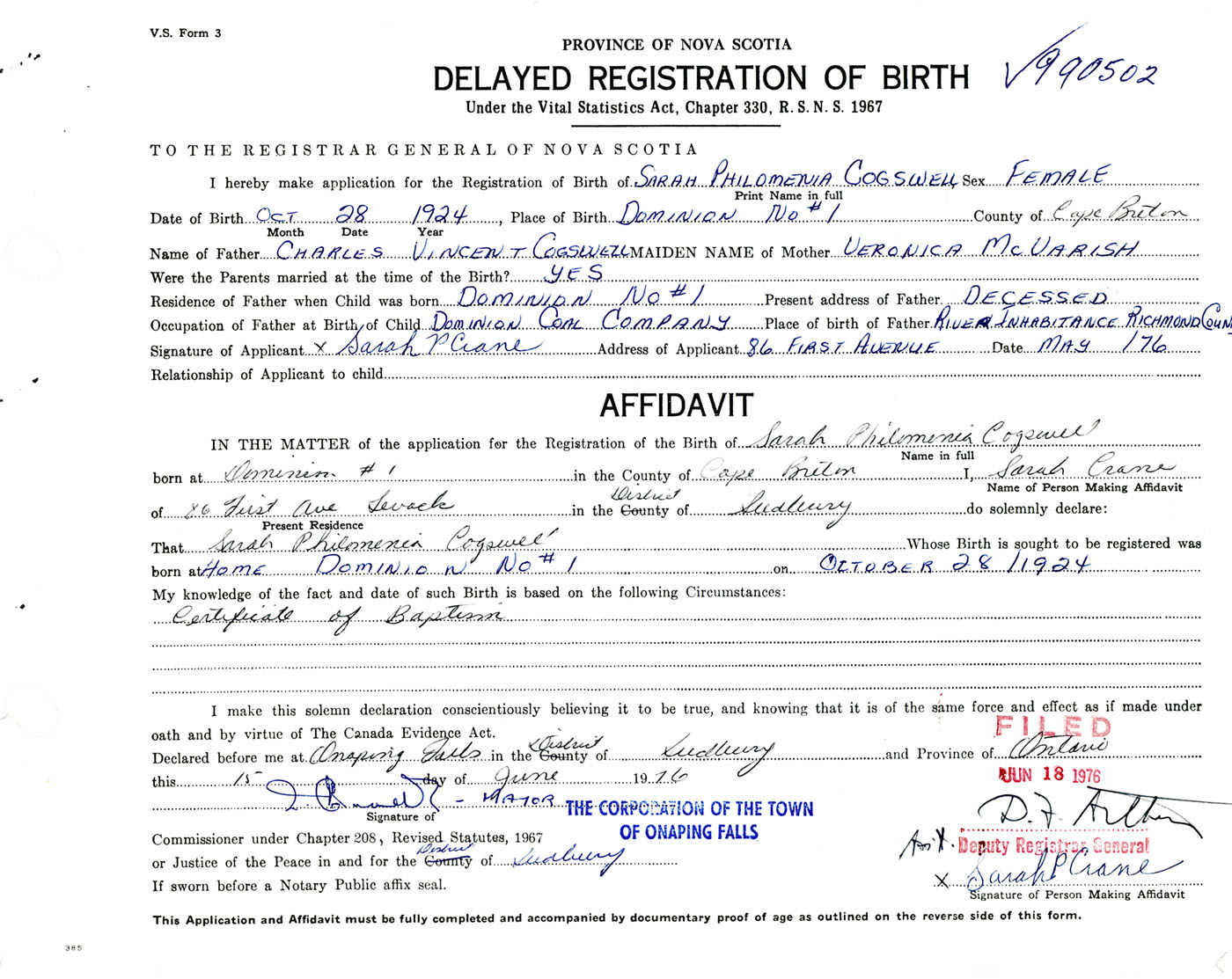 IN THE MATTER of the application for the Registration of the Birth of Sarah PhilomeniaCogswell