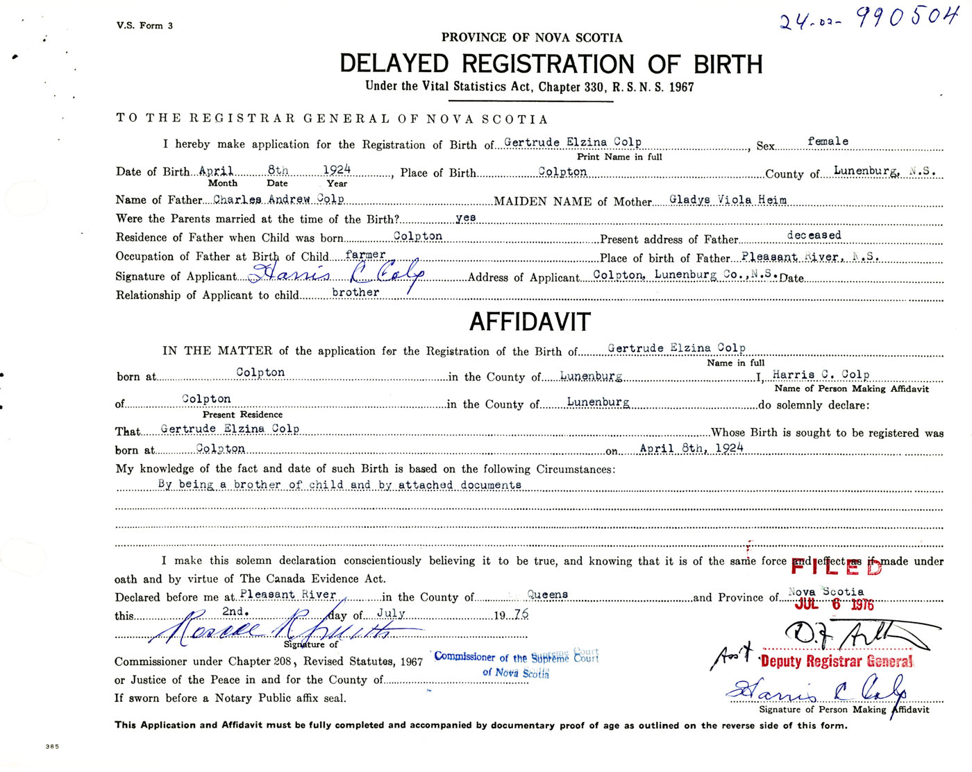 Signature of Applicant Harris L. Colp Address of Applicant Colpton, Lunenburg Co., NS Date 2 July 1976