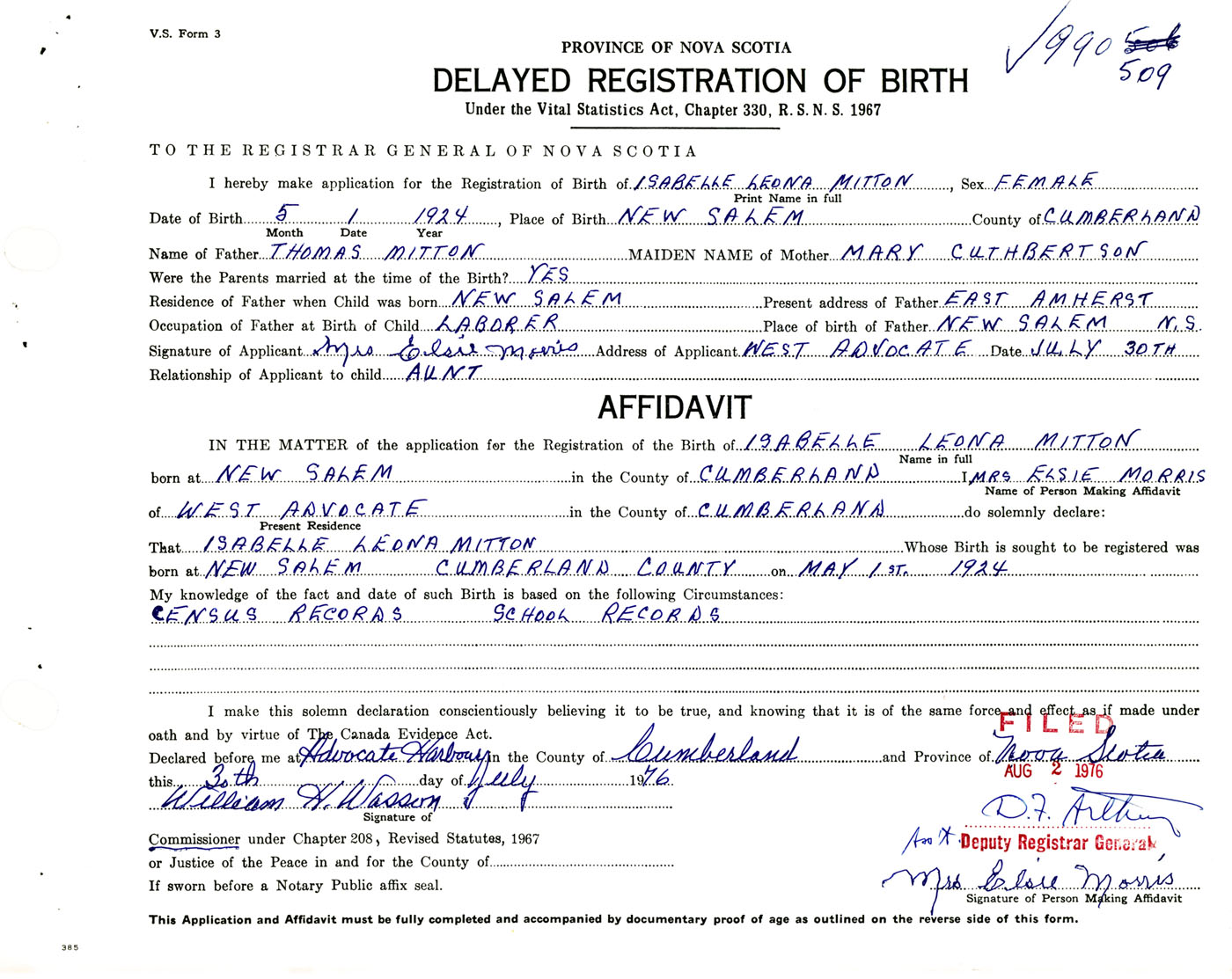 Signature of Applicant Mrs. Elsie Morris Address of Applicant West Advocate, Cumberland Co., NS Date 30 July 1976