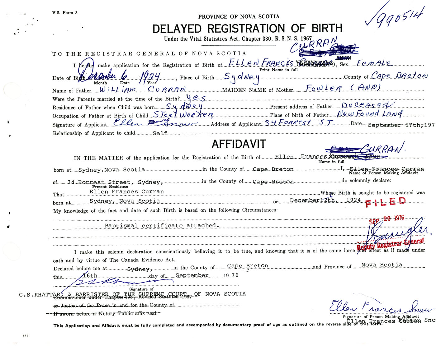 Signature of Applicant Ellen Frances Snow Address of Applicant 34 Forrest Street, Sydney, Cape Breton Co., NS Date 17 September 1976
