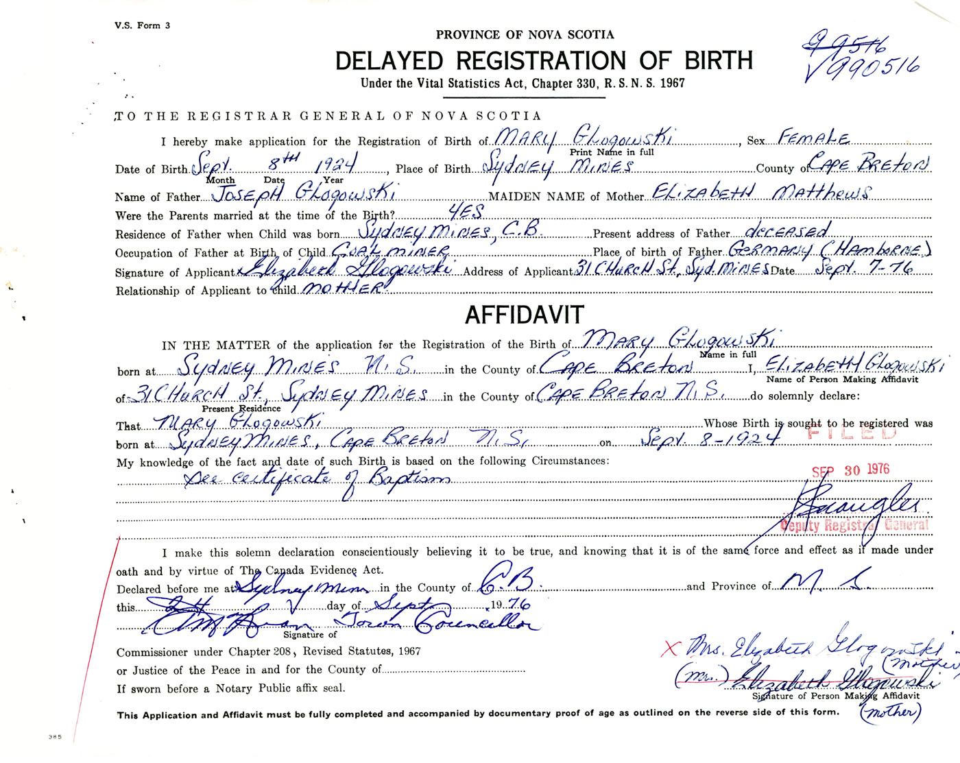 Signature of Applicant Elizabeth Glogowski Address of Applicant 31 Church Street, Sydney Mines, Cape Breton Co., NS Date 7 September 1976