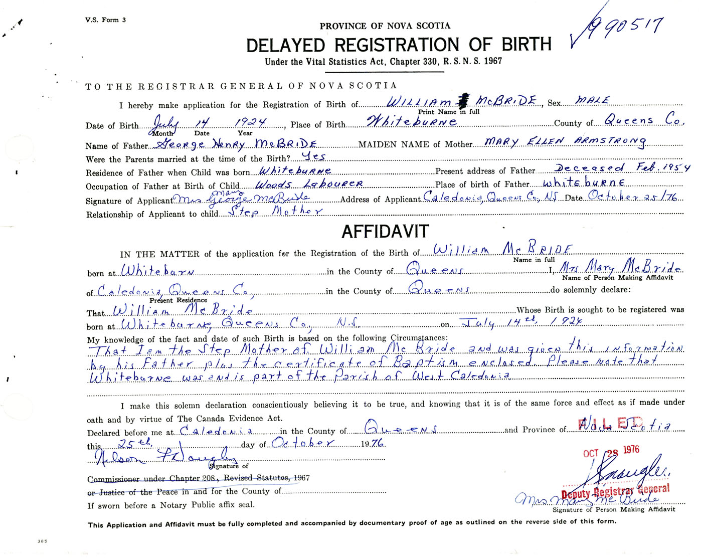 Signature of Applicant Mrs. George (Mary) McBride Address of Applicant Caledonia, Queens Co., NS Date 25 October 1976