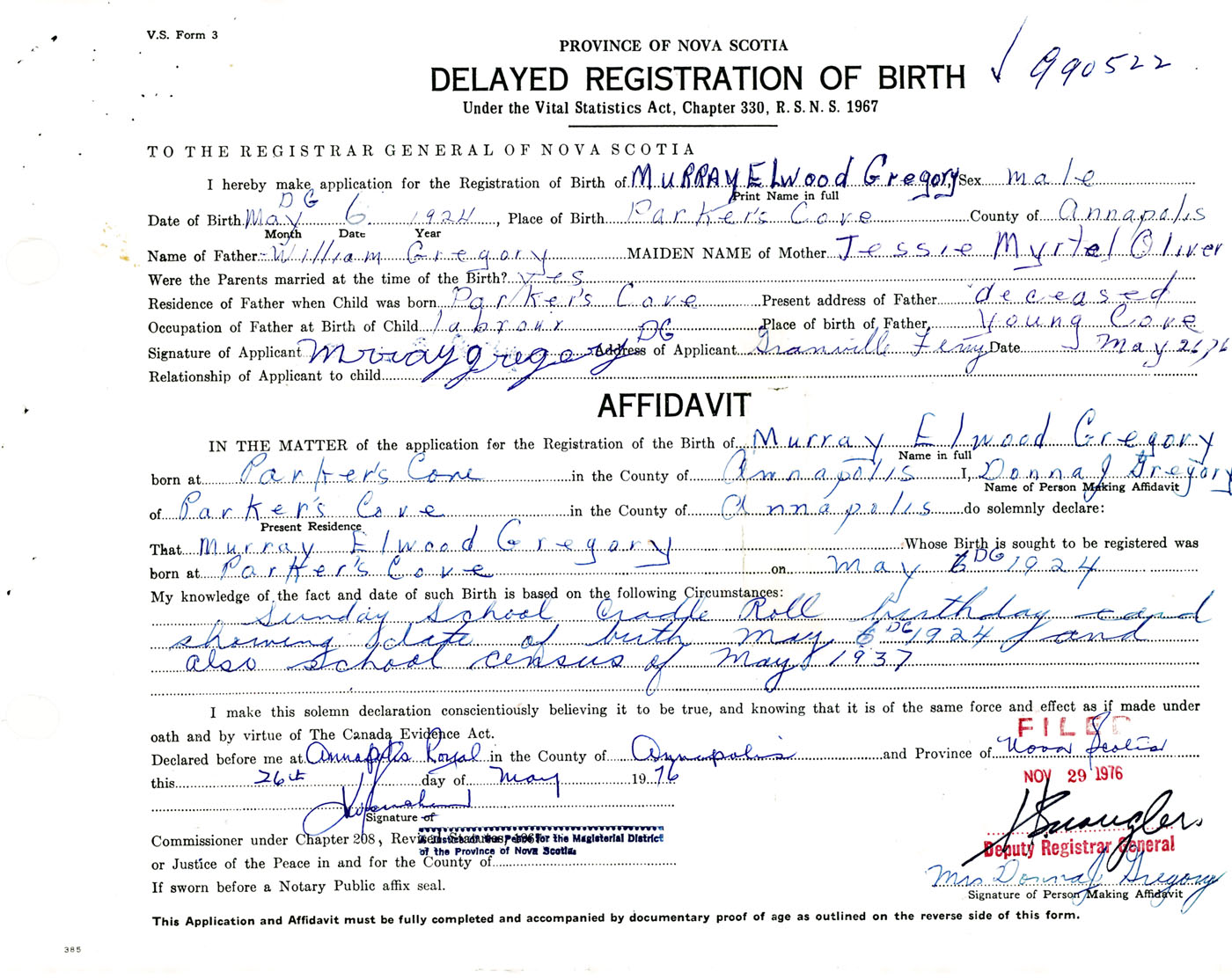 Signature of Applicant Murray Gregory Address of Applicant Granville Ferry, Annapolis Co., NS Date 26 May 1976
