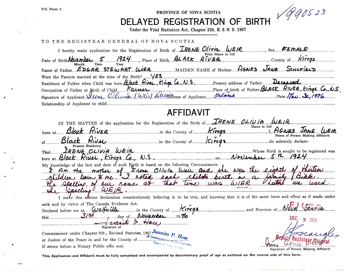 IN THE MATTER of the application for the Registration of the Birth of Irene OliviaWeir