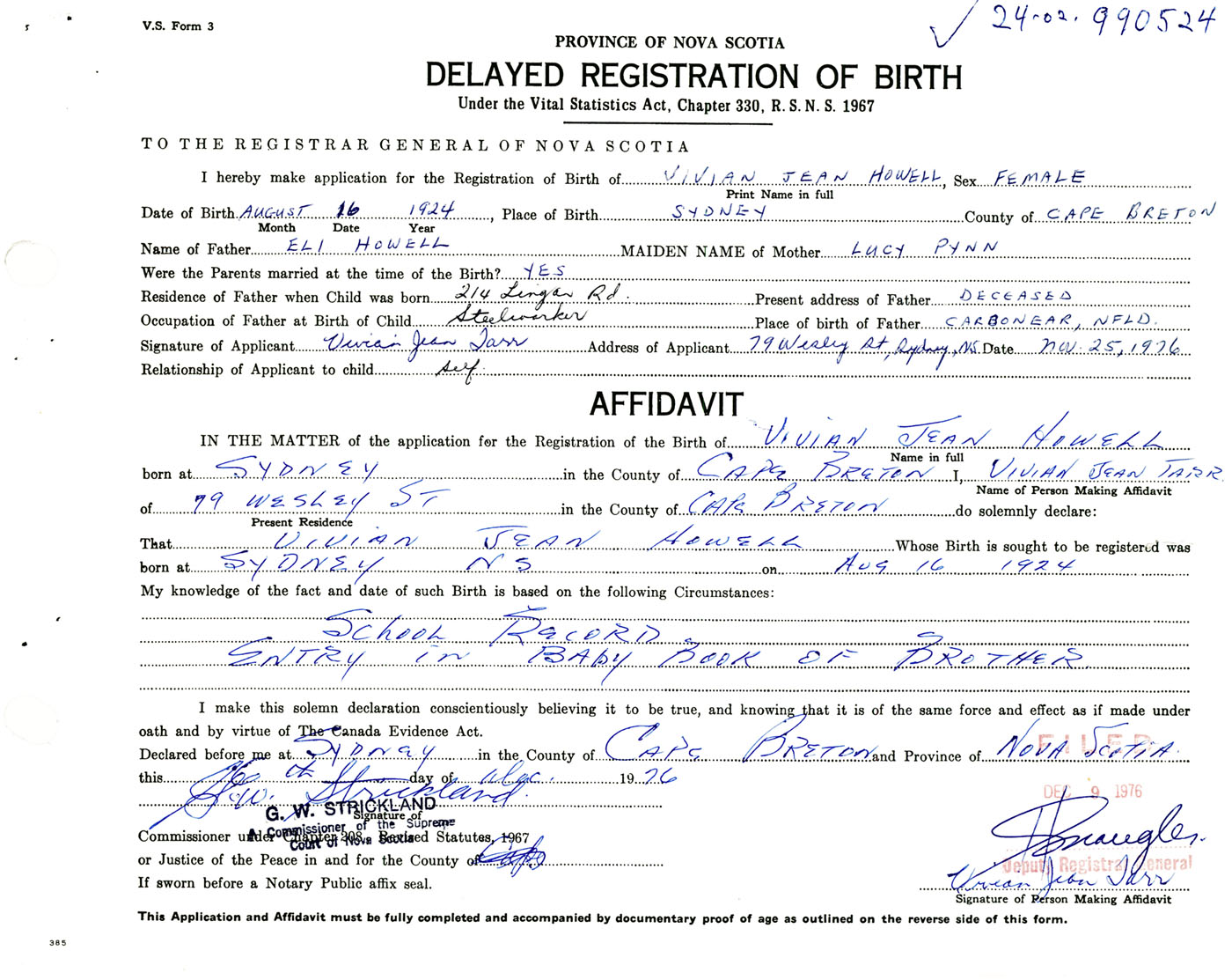 Signature of Applicant Vivian Jean Tarr Address of Applicant 79 Wesley Street, Sydney, Cape Breton Co., NS Date 25 November 1976