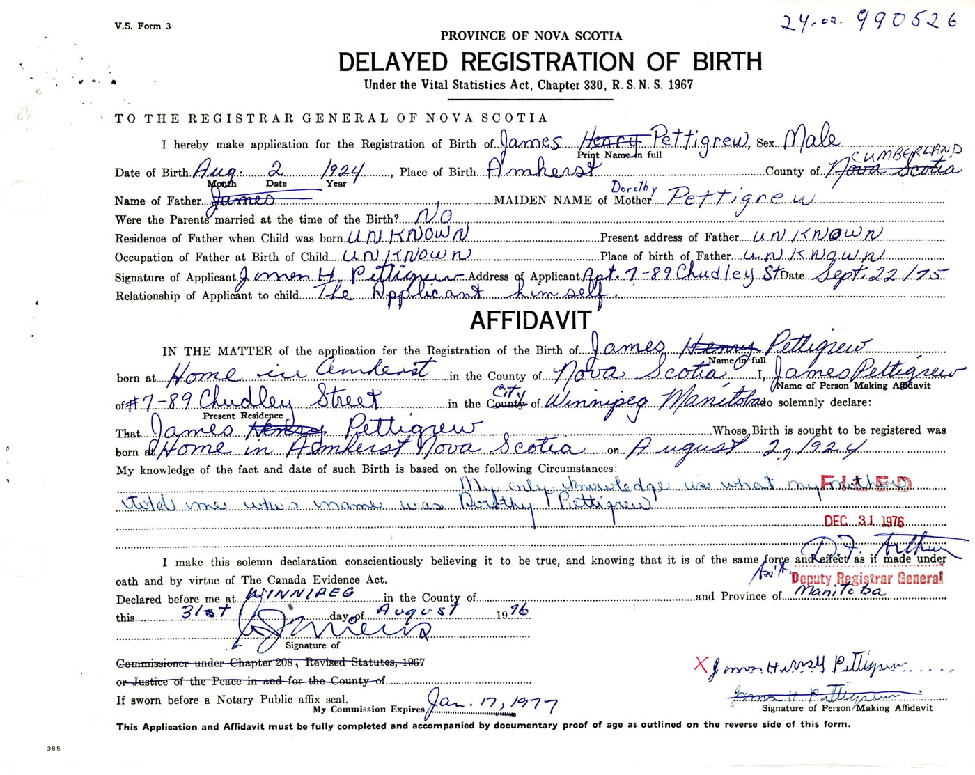 Signature of Applicant James H. Pettigrew Address of Applicant Apt. 7 - 89 Chudley Street, Winnipeg, Manitoba Date 22 September 1975