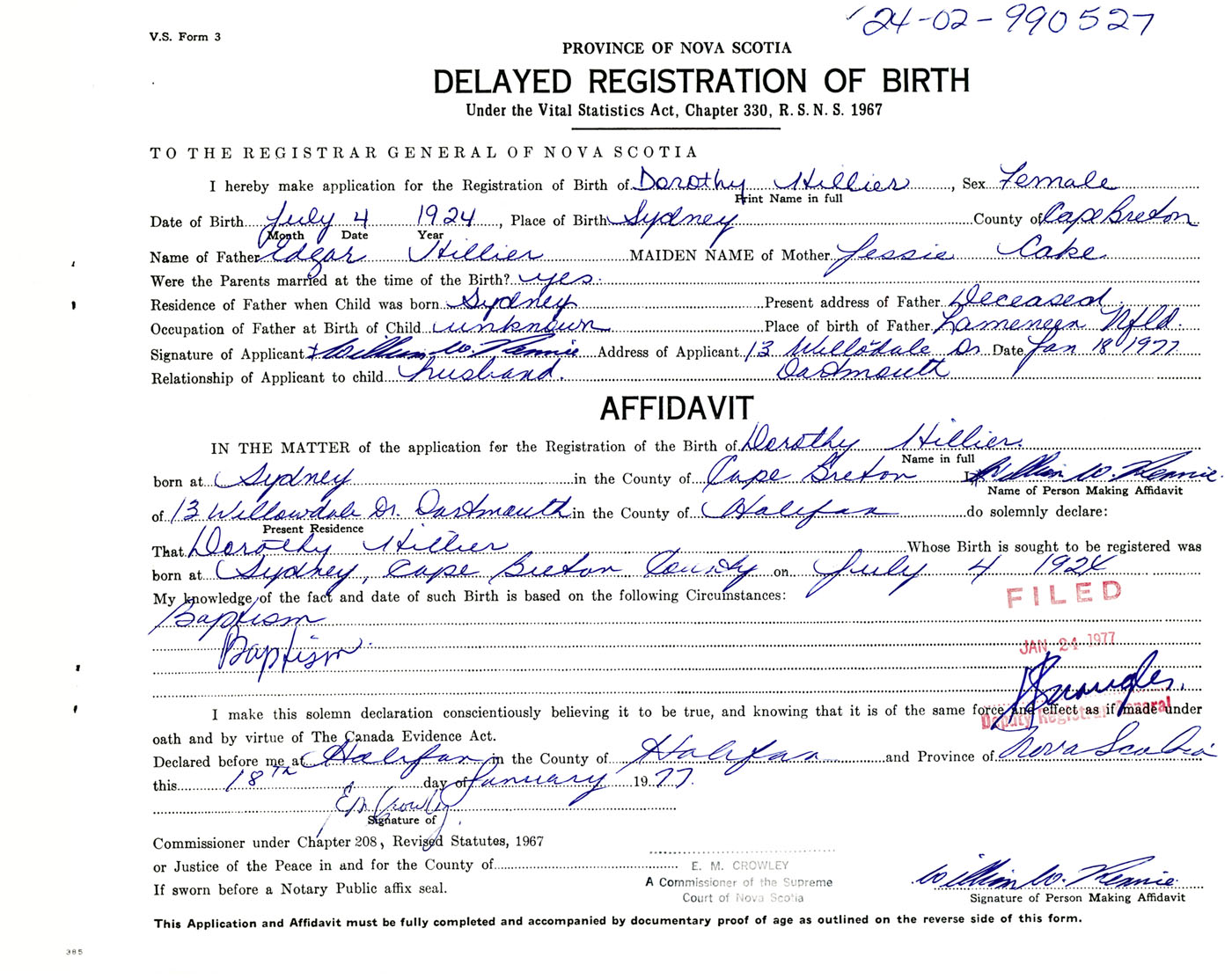 I hereby make application for the Registration of Birth of DorothyHillier Sex Female