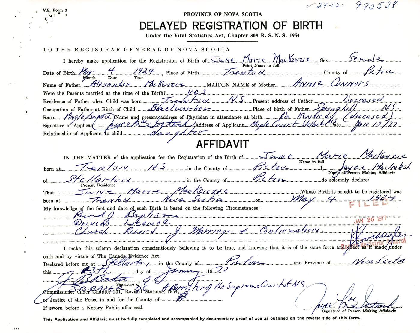 Signature of Applicant Joyce MacIntosh Address of Applicant Maple Court, Stellarton, Pictou Co., NS Date 13 January 1977