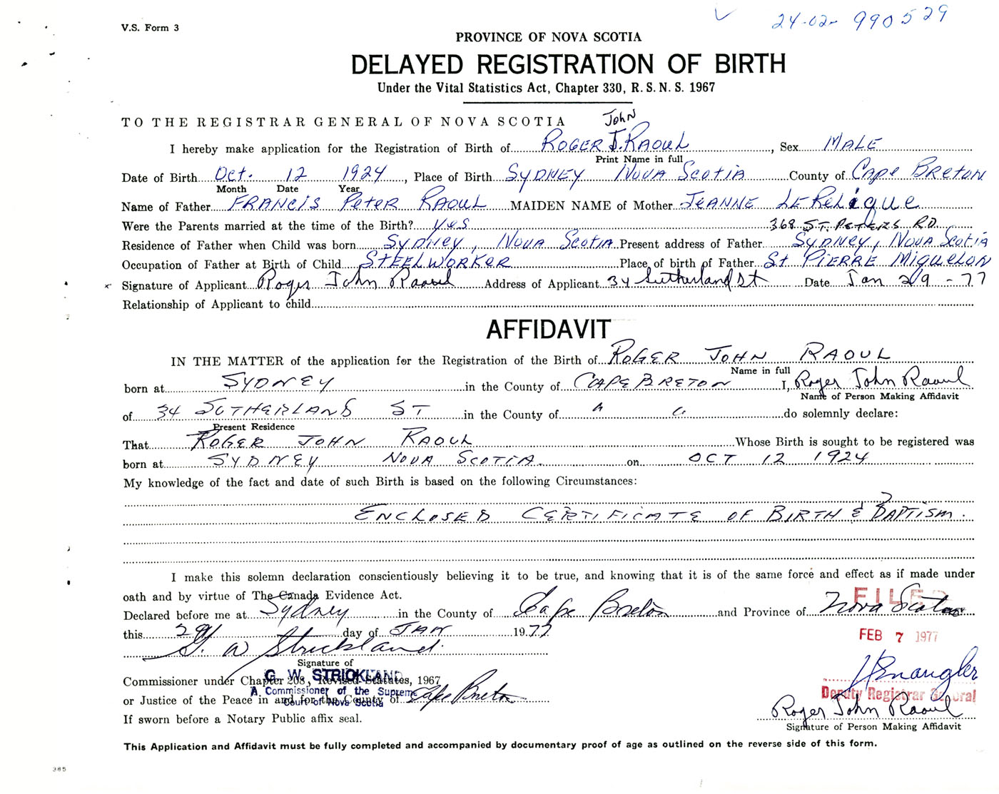 Signature of Applicant Roger John Raoul Address of Applicant 34 Sutherland Street, Sydney, Cape Breton Co., NS Date 29 January 1977