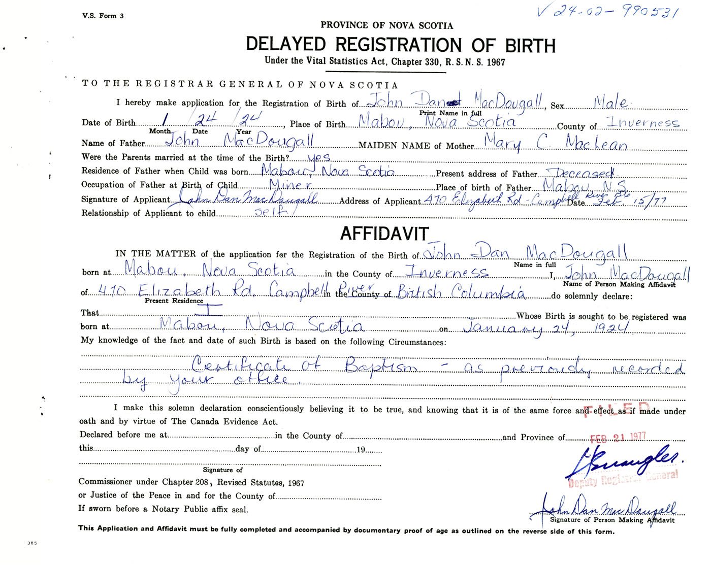 Signature of Applicant John Dan MacDougall Address of Applicant 470 Elizabeth Road, Campbell River, British Columbia Date 15 February 1977