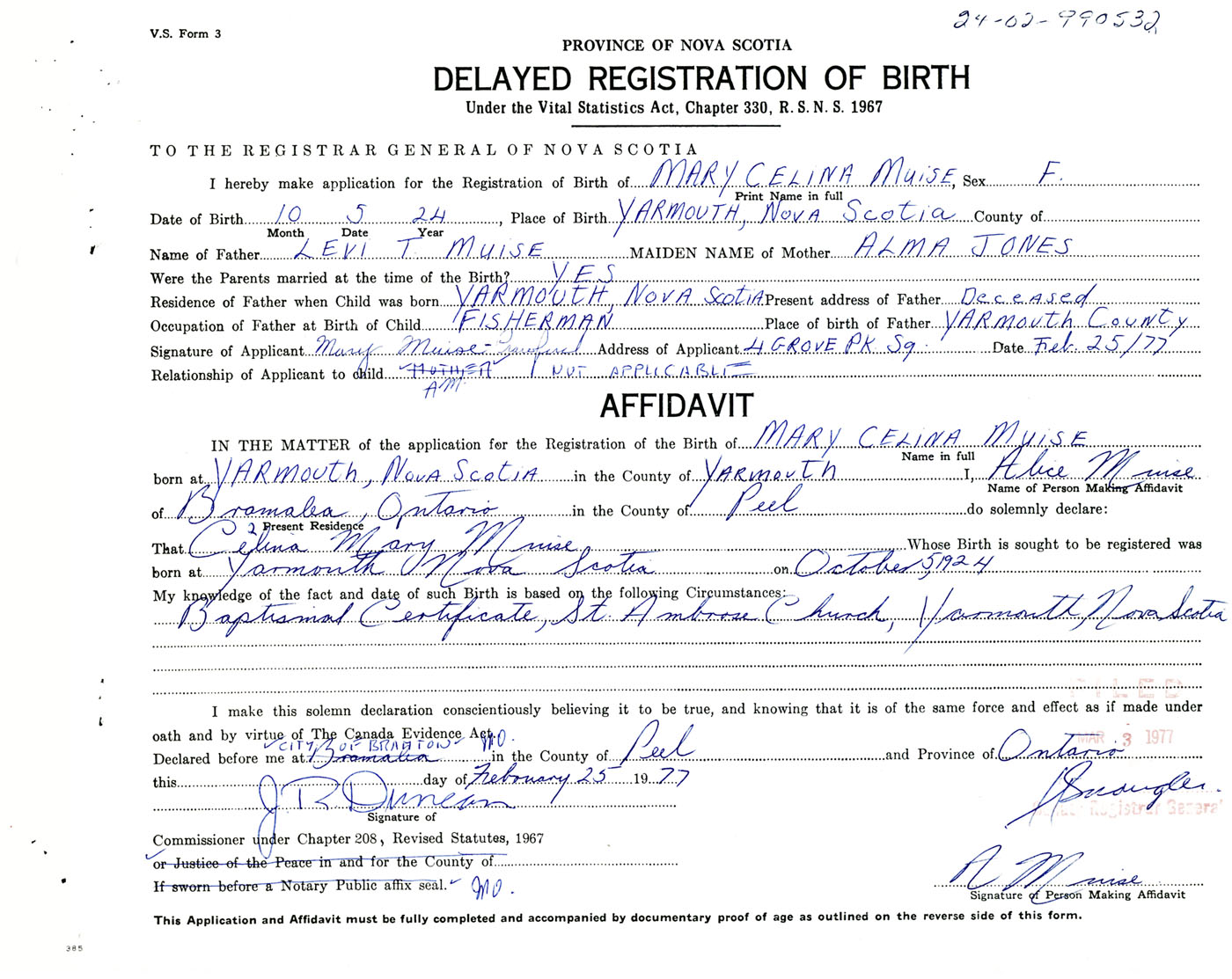 Signature of Applicant Mary Muise Crawford Address of Applicant 4 Grove Park Square, Brampton, Ontario Date 25 February 1977