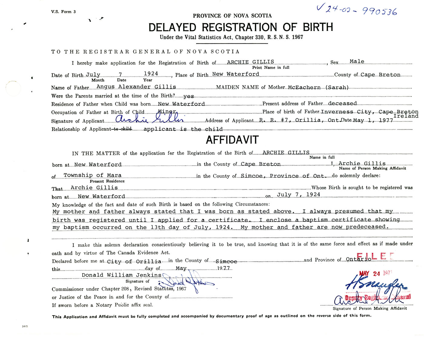 I hereby make application for the Registration of Birth of ArchieGillis Sex Male