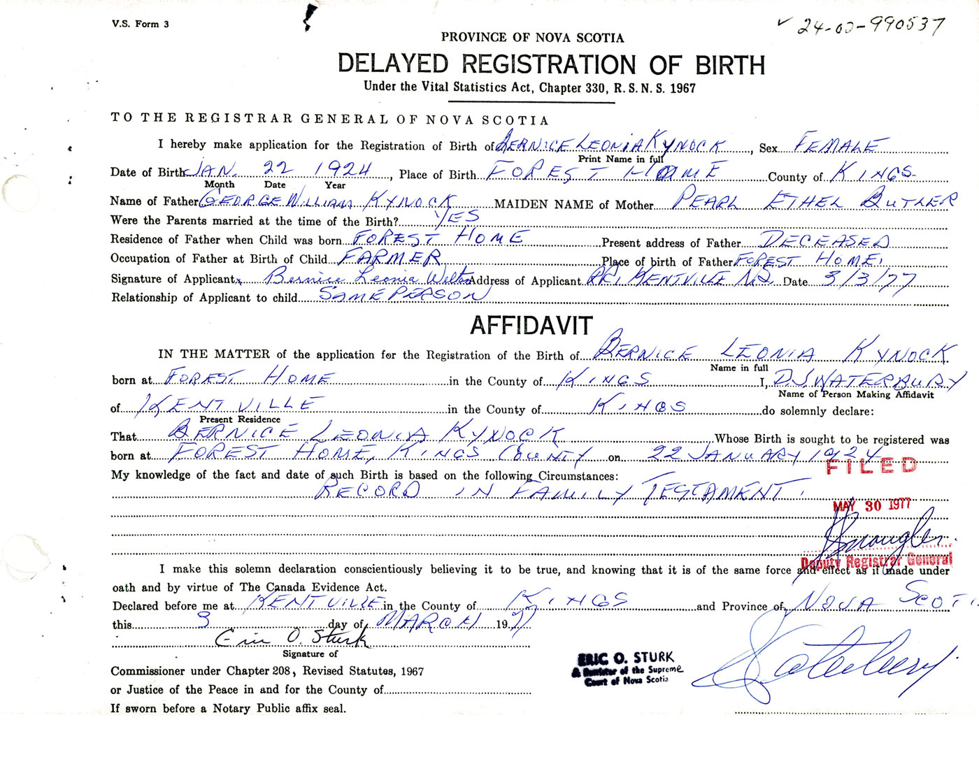 IN THE MATTER of the application for the Registration of the Birth of Bernice LeoniaKynock