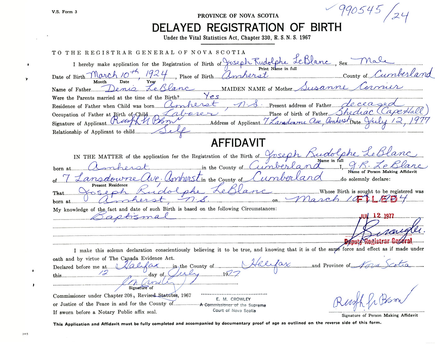 Signature of Applicant Rudolph LeBlanc Address of Applicant 7 Lansdowne Avenue, Amherst, Cumberland Co., NS Date 12 July 1977