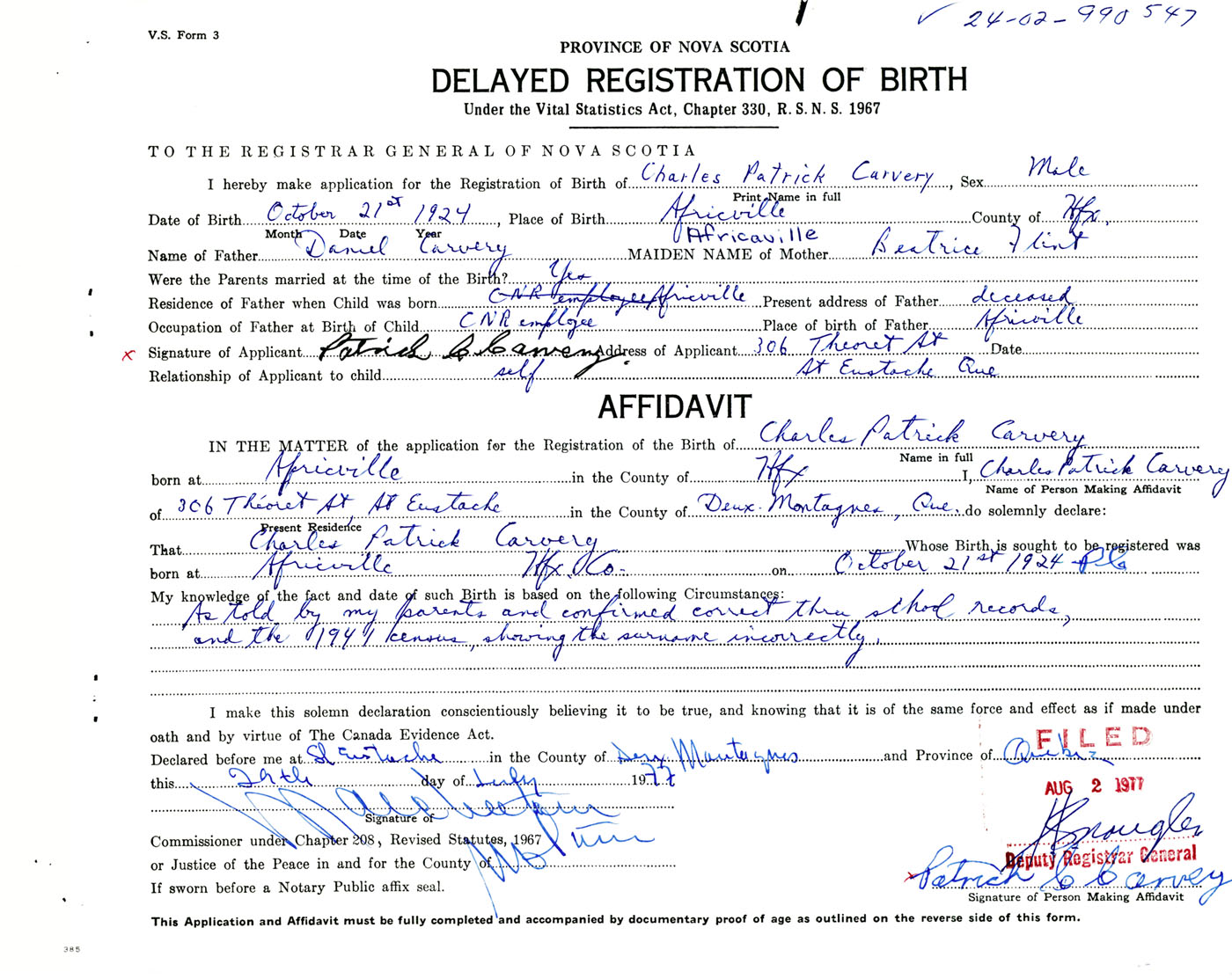 IN THE MATTER of the application for the Registration of the Birth of Charles PatrickCarvery