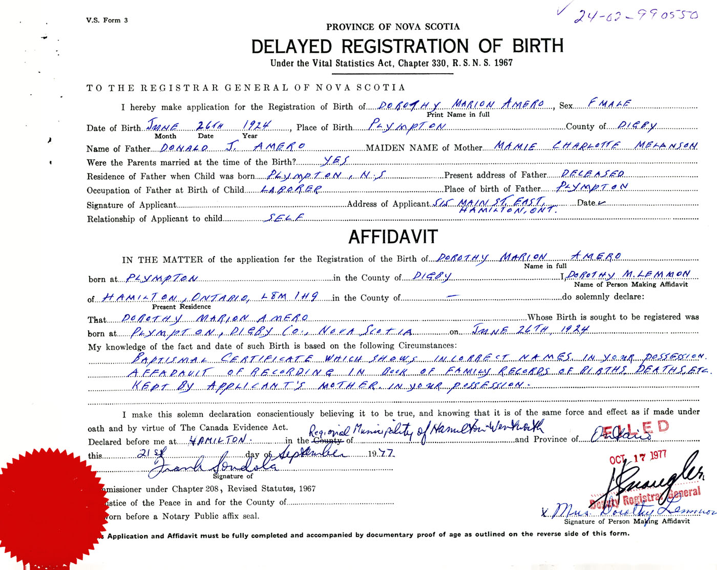 I hereby make application for the Registration of Birth of Dorothy MarionAmero Sex Female