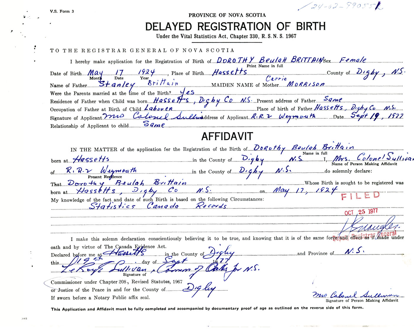Date of Birth May 17, 1924 Place of Birth HassettsCounty of Digby