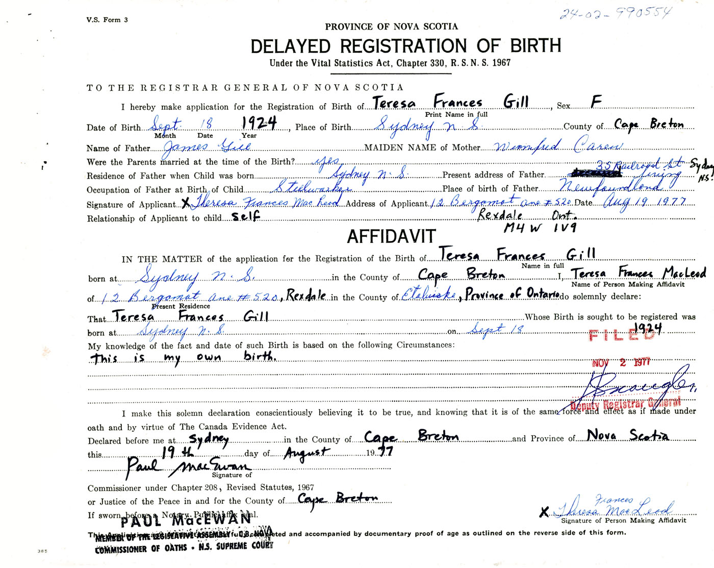 Signature of Applicant Theresa Frances MacLeod Address of Applicant 12 Bergamot Avenue, Apt 520, Rexdale, Ontario, M4W 1V9 Date 19 August 1977