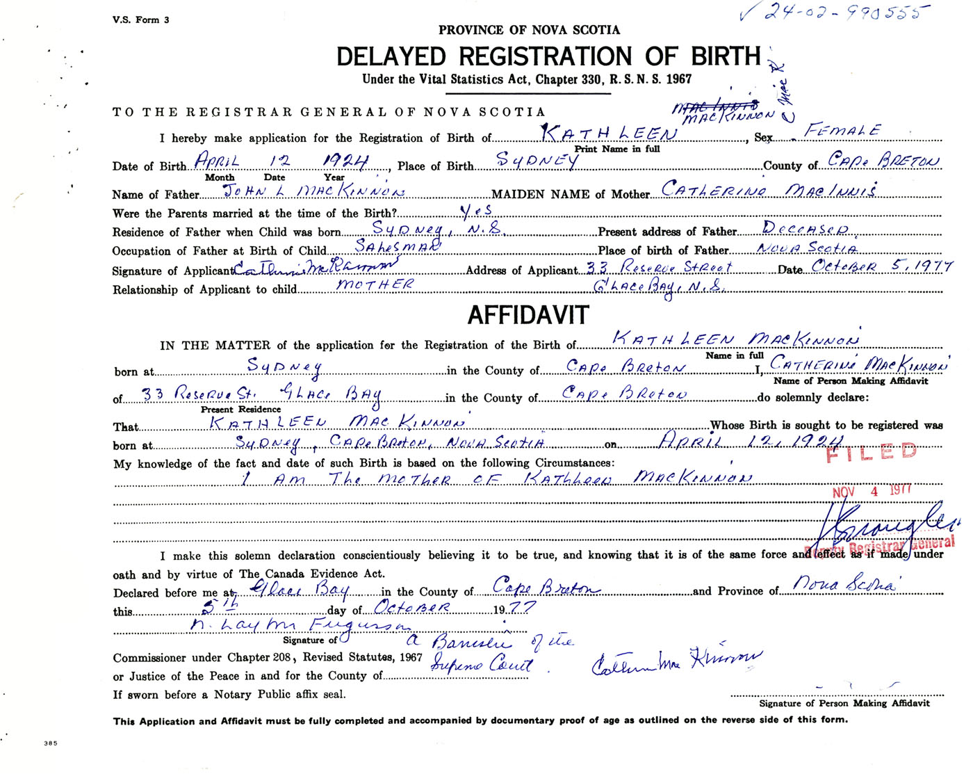 IN THE MATTER of the application for the Registration of the Birth of KathleenMacKinnon
